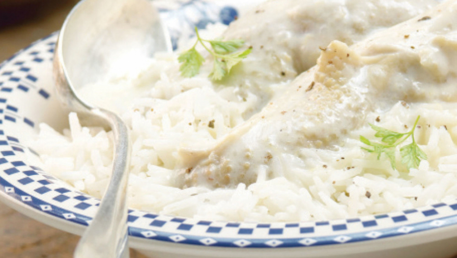Od pilećih grudi i zeleni skuvati supu. Skuvano meso iseći na krupnije komade. Na malo putera ili ulja kratko propržiti sitno iseckan beli luk, dodati brašno, pa naliti nekoliko kutlača supe (oko pola litra), uz neprestano mešanje. Kada se sos zgusne, spustiti komade mesa i ostaviti na tihoj vatri još nekoliko minuta. Ako je sos gust, razrediti ga supom. Začiniti belim biberom i limunovim sokom ili sirćetom pre služenja. Prijatno!