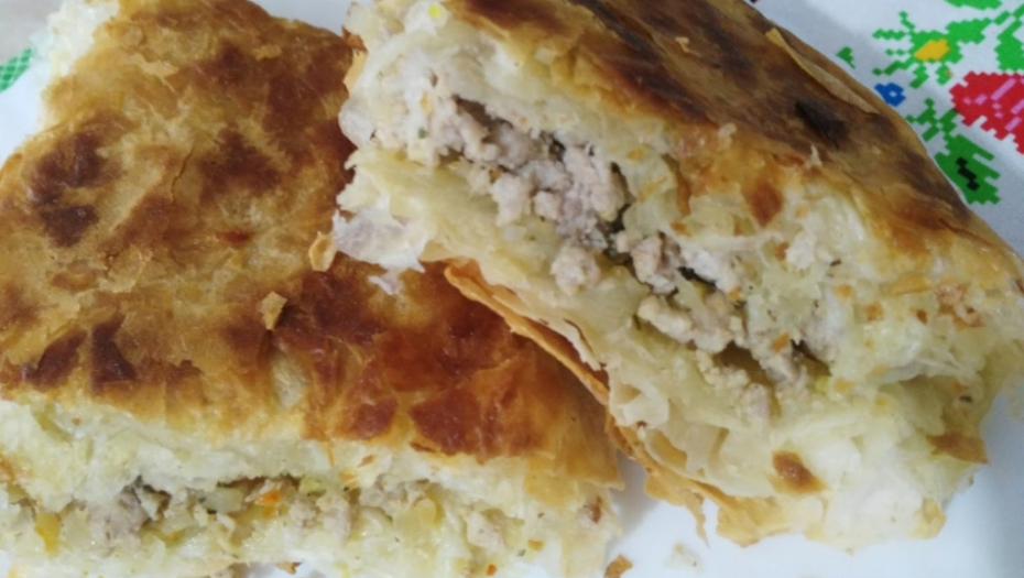 Na ulju propržiti glavicu luka, dodati meso i njega propržiti, zatim dodati so i biber. Tepsiju okruglu obložiti pek papirom ili je samo namazati uljem, pa na dno staviti jednu koru i pouljiti. Sve sledeće kore premazati malo uljem, zgužvati je i ređati u pleh.