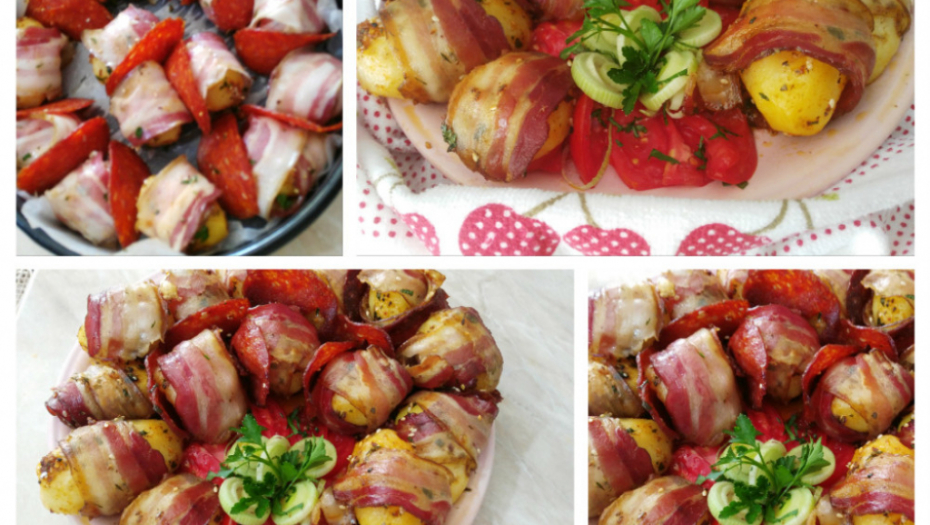U činiju dodati sve začine nabrojane sitno iseckane. Sve dobro izmešati. Krompir dobro pouljiti maslinovim uljem pa uvaljati u začine i uviti u pančetu slaninu. Između staviti listove kulena. Sve to poređati u tepsiju u koju ste stavili pek papir. Peći na 200 stepeni C oko 30 min da nam se krompir dopeče i sve lepo zarumeni.