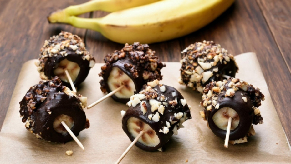 Bananu presecite na pola ili na četvrtine, potom ih nabodite na drveni štapić i stavite u friz da stoje oko pola sata. Za to vreme istopite čokoladu i pripremite posudu sa iseckanim orasima, bademima i lešnicima. Izvucite banane iz friza i potopite ih u čokoladu, a potom uvaljajte u bademe. Čokoladne banane sad ređajte na papir za pečenje i ponovo ih vratite u friz da stoje bar pola sata.