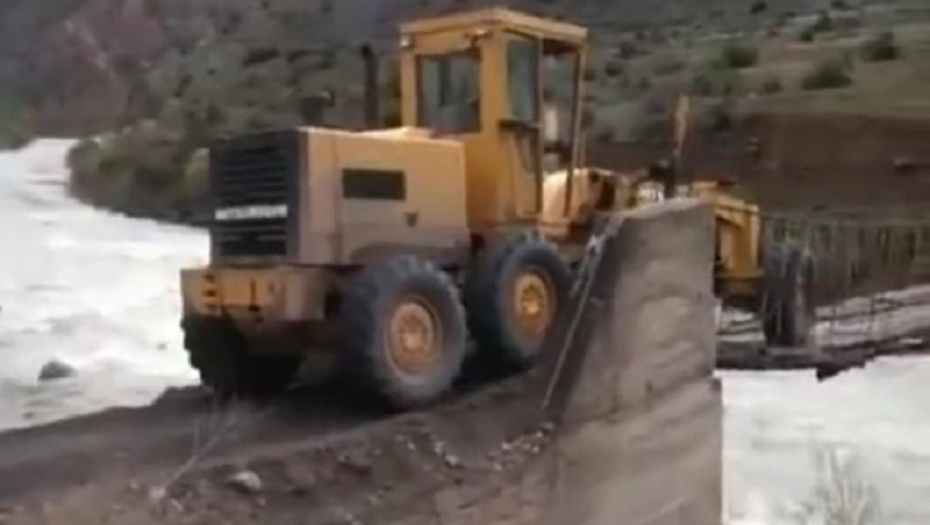 Preko mosta sličnog (ne)kvaliteta jedan opasno dobar ili lud majstor vožnje uspeo je da protera građevinsku mašinu.
