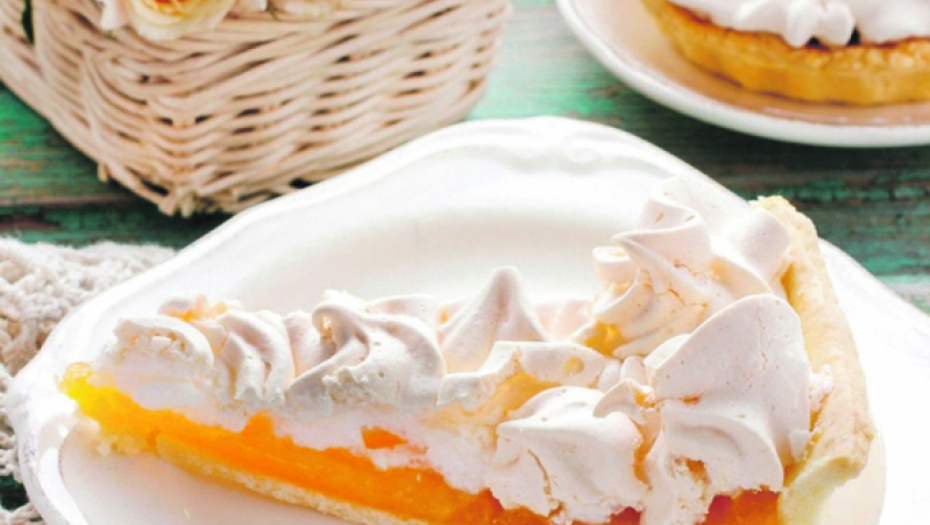 4 veće breskve, 500 ml mleka, 3 kašike šećera, puding od vanile, 4 žumanceta, limun za mereng, 4 belanceta, 250 g šećera, kašika soka od limuna