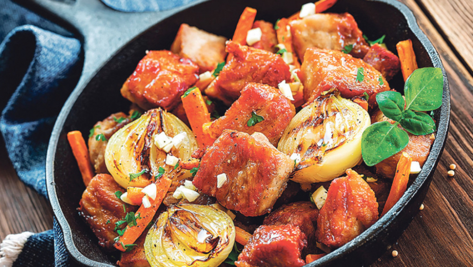 Izlupajte šnicle, isecite ih na veće kocke, posolite i propržite na malo ulja. Sklonite ih, pa u isto ulje dodajte krupnije isečen luk, tikvicu sečenu na kocke, boraniju, kukuruz i šargarepu isečenu na tanke štapiće. Sve začinite mešavinom začina i dinstajte oko 15 minuta, da povrće omekša. Zatim povrće prekrijte šniclama, pobiberite i poklopite tiganj, pa dinstajte na tihoj vatri još nekoliko minuta.