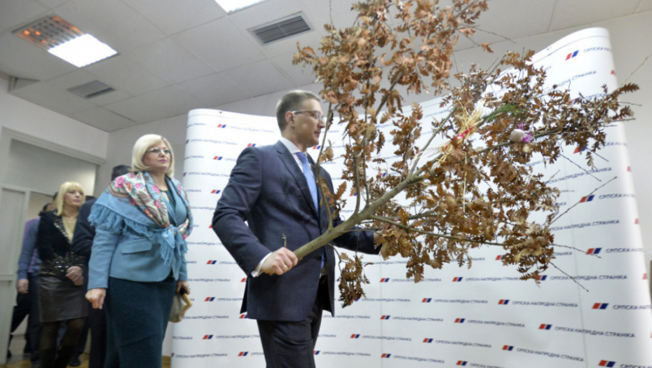 Potpredsednik Srpske napredne stranke Nebojša Stefanović u pratnji Jorgovanke Tabaković i Jadranke Joksimović uneo je danas badnjak u stranačke prostorije na Novom Beogradu.