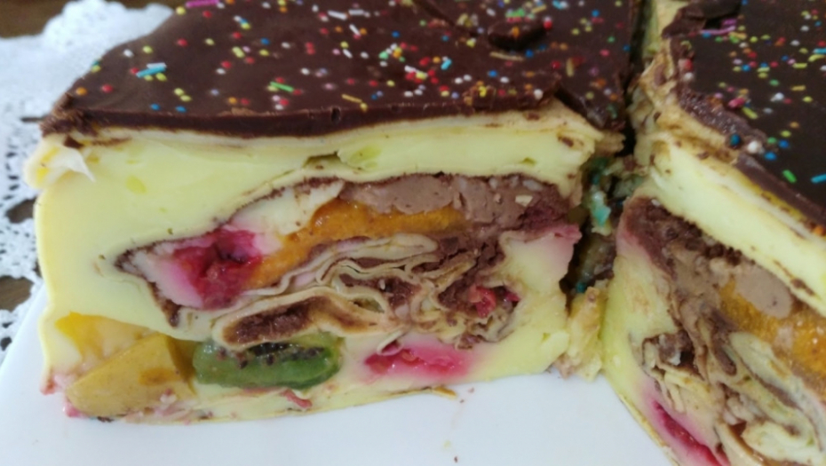 Sipati puding preko palačinki, dodati ostatak seckanog voća i ostatak pudinga. Vratiti palačinke koje su bile savijene preko pleha, razmazati malo pudinga po njima i staviti odozgo jednu palačinku da sve pokrije. Ostaviti da se dobro ohladi pa okrenuti na tanjir i preliti čokoladom.