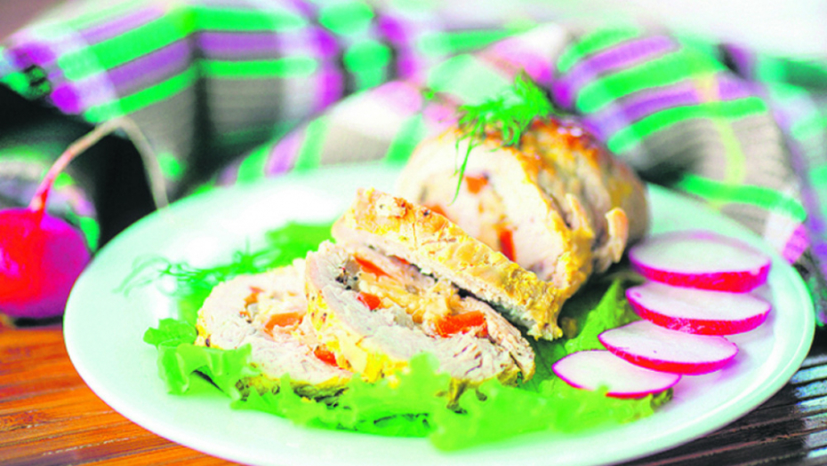 Priprema: Pileće belo meso isecite na četiri veće šnicle, a zatim ih blago izlupajte čekićem za meso. Pečene paprike oljuštite, očistite od semenki, pa ih isecite na trake. Svaku šniclu belog mesa začinite solju i biberom, pa preko svake složite po dva lista suvog vrata, pripremljenu pečenu papriku i sir isečen na štapiće. Urolajte belo meso, pričvrstite ga čačkalicama ili kuhinjskim koncem i ispecite na malo zagrejanog ulja.