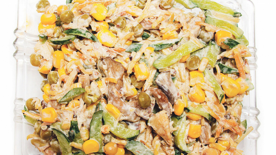 Priprema: Skuvajte pileće belo meso, dinstajte šampinjone i obarite pirinač i kukuruz šećerac. Kada se piletina ohladi, iseckajte je na sitno, a pečurke isecite na krupnije kocke. Obareni pirinač i kukuruz šećerac dobro ocedite. Izmešajte piletinu sa pečurkama, ohlađenim pirinčem i kukuruzom, sitno iseckanim kiselim krastavčićima, majonezom, pavlakom i origanom. Posolite i pobiberite po ukusu.