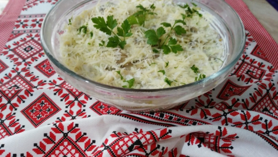 Na ulju propržiti na kolutove praziluk da bude baš mekan, pa dodati šampinjone sečene na listiće i sve to prodinstati. Dodati začin, so, biber.