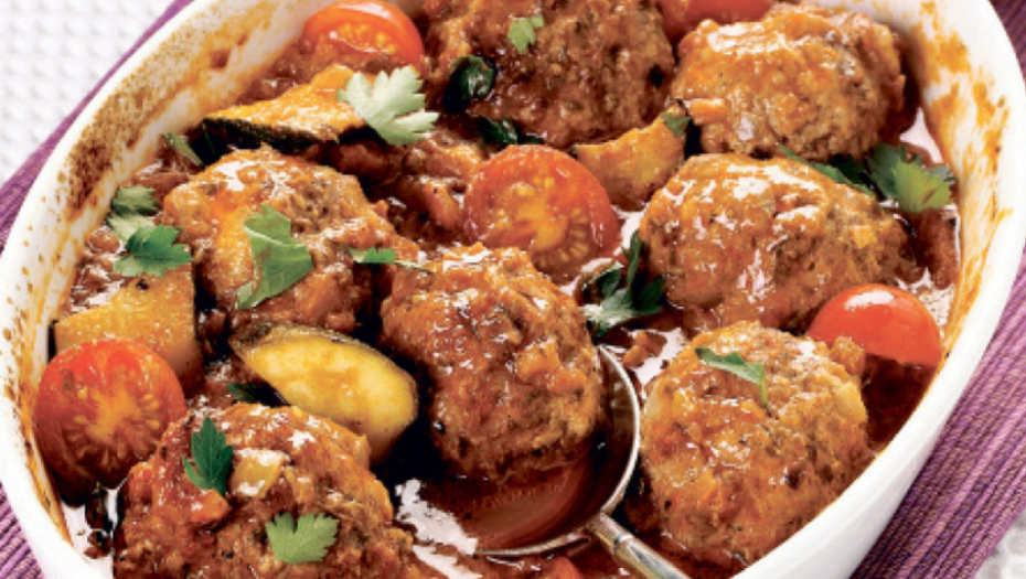 Krompir očistiti, oprati i izrendati. Dodati mu mleveno meso i sve začine. Crni i beli luk iseći na sitne kockice i dodati smesi. Dodati jaja i prezle. Rukom mesite testo da se sjedine sastojci. Ostavite smesu dva sata u frižideru. Ulje zagrejte, od mase pravite male kuglice i ubacite ih na vrelo ulje da se prže sa jedne i druge strane. Kad budu uhvatile lepu rumenu boju, izvadite ih na ubrus da se ocedi višak masnoće. Tikvice očistiti i iseći na sitne kocke. U šerpu stavite malo ulja i dodajte tikvice, naliti sa dva decilitara vode i pustiti da se tikvice dinstaju. Kad tikvice omekšaju, dodati oljušten i isečen paradajz i poređati ćufte. Dodati još vode i pustiti da se ćufte krčkaju na laganoj vatri još sat vremena. Dodati začine po želji. Skloniti sa ringle i dodati dosta seckanog peršuna. Prijatno!