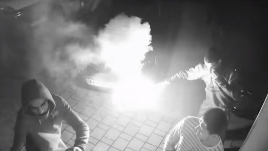 Posle nekoliko trenutaka napadači su pobegli, a baklju su bacili prema radnicima. Baklja se odbila od zgrade i otkotrljala pod automobil.