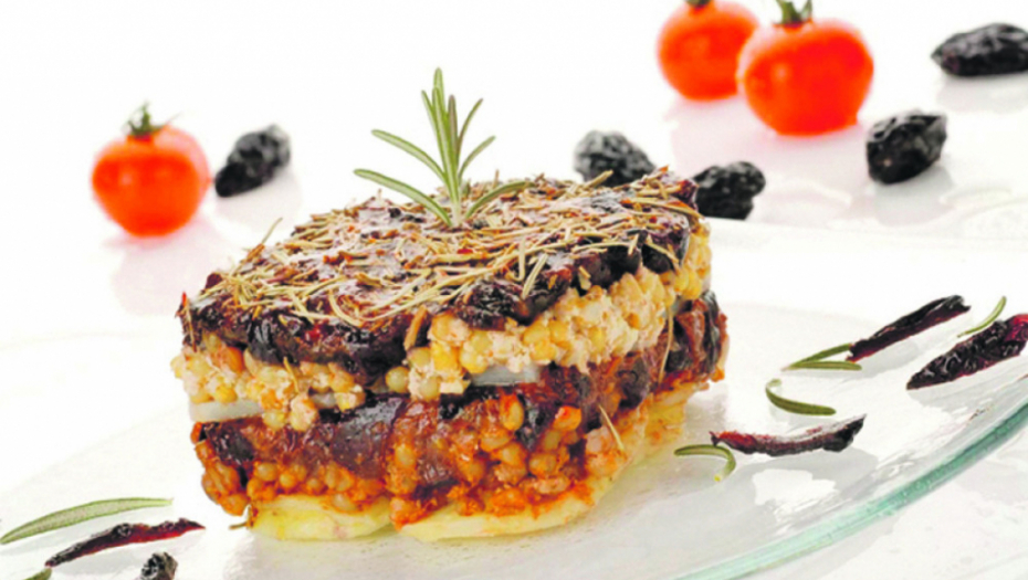 Krompir isecite na tanke kolutove, pšenicu skuvajte, a suve šljive malo obarite. U vatrostalnu činiju ređajte prvo krompir, sitno seckane suve šljive, a zatim pšenicu pomešanu sa orasima. Paradajz-pire razblažiti bujonom od povrća i time preliti musaku. Pospite je ruzmarinom i pecite 45 minuta na 200 stepeni.
