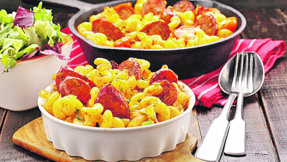Kobasice isecite na manje komade i na zagrejanom maslinovom ulju ih ispržite. U posoljenoj vodi skuvajte testeninu da bude al dente i ocedite je. Izvadite kobasice i u masnoću koju su pustile umešajte dobro oceđenu testeninu. Pomešajte s kobasicama, pobiberite i pospite svežom majčinom dušicom.