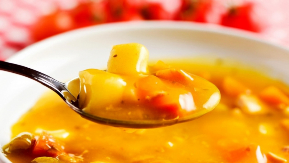 Meso isecite na kockice jednake veličine. Malo pospite suvim začinom i mlevenom paprikom. Izmešajte i ostavite da odstoji. U posudu stavite ulje i propržite piletinu da porumeni. Dodajte sitno iseckan crni luk i dinstajte. Papriku isecite na kockice i sve zajedno poklopljeno prodinstajte na srednjoj temperaturi. Kada paprika omekša, nalijte bujon i prokuvajte. Dodajte pelat i ostavite da prokuva. Krompir isecite na kocke i stavite u paprikaš da se skuva. Ako je potrebno, dodajte toplu vodu. Kuvajte na srednjoj temperaturi. Paprikaš je gotov kada se krompir skuva. Nije potrebno zapržavati jer jelo dobije gustinu od luka i krompira. Po želji možete skuvati njoke ili neko drugo testo.