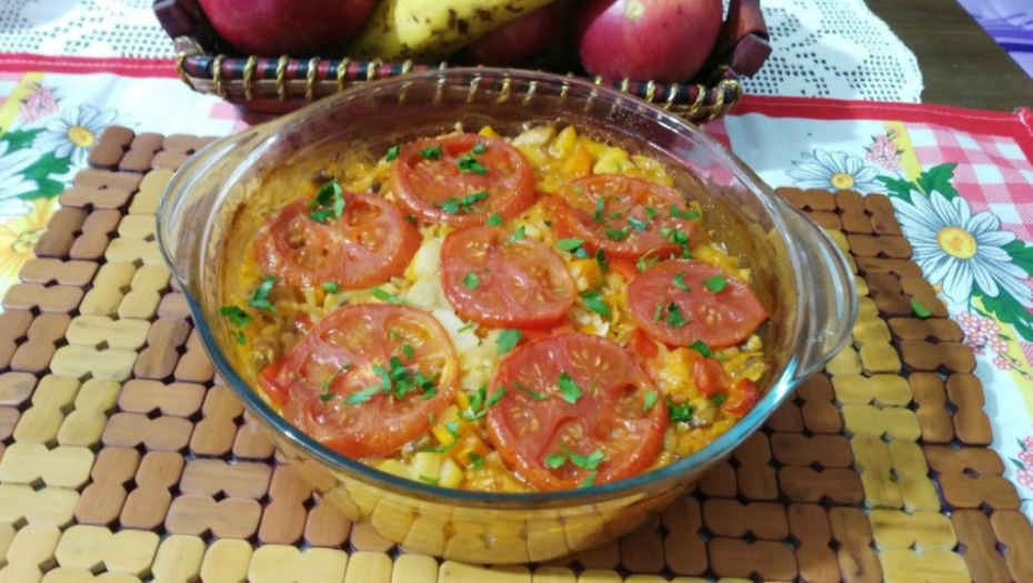 Đuveč podmazati uljem pa istresti spremljenu i dinstanu masu izjednačiti, a odozgo poređati kolutove paradajza. Malo pouljiti pa peći u rerni na 200 stepeni C oko 40 min.