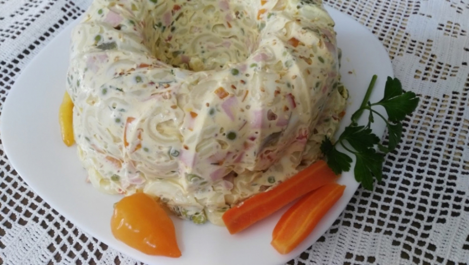Skuvati makarone i procediti i ohladiti. Dodati sve navedene namirnice i dobro izmešati.
