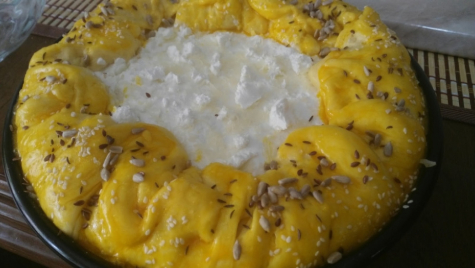 Ivice koje su preko tepsije vratiti u tepsiju pa ivice uštinuti i spajati pa sve u krug. Ostaviti pogaču da naraste pa je namazati žumancetom i posuti susamom. Pogaču peći na 200 stepeni C pa je smanjiti na 180 stepeni oko 40 min.