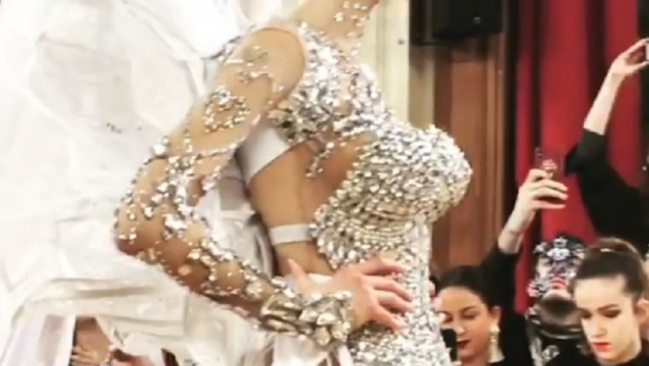 Reč je o prozirnoj venčanici koja pada do poda i u potpunosti orkiva noge. Srebrni vez je uspeo da sakrije intimnu regiju, dok su zlatni detalji prekrivali predeo grudi i struka.