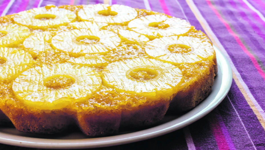 U pleh stavite malo ulja, pospite šećerom i poređajte kolutove ananasa. Margarin penasto umutite sa šećerom. Umešajte jedno po jedno jaje, polovinu brašna, mleko, preostalo brašno i orahe. Testo prelijte preko ananasa, poravnajte i pecite na 200 stepeni 40-45 minuta. Kada kolač bude gotov, prevrnite ga na tacnu, isecite na kriške, po želji ih dekorišite šlagom i poslužite.