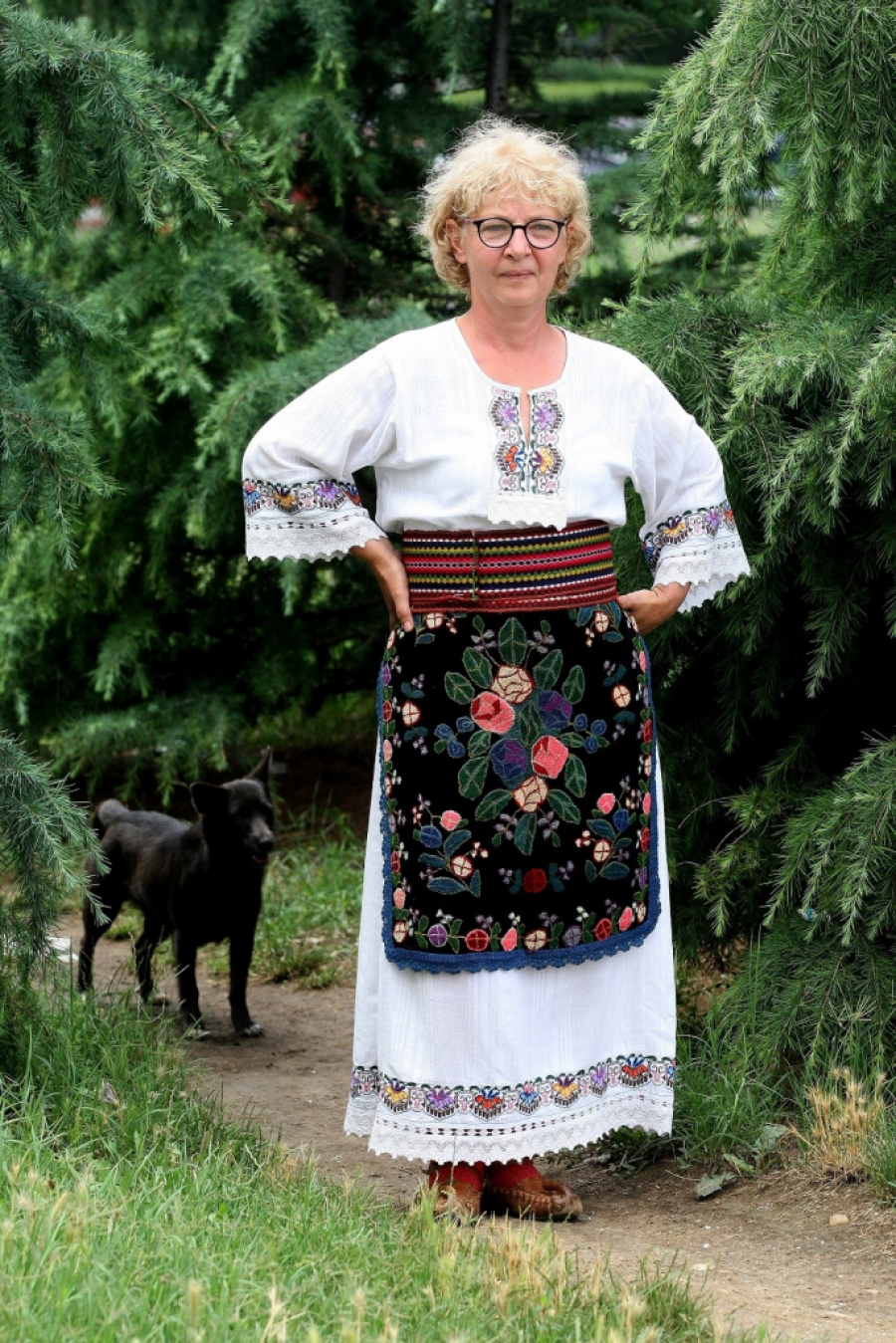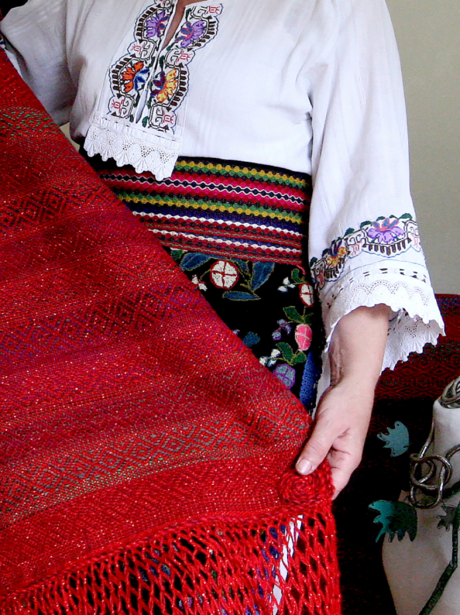 Kada smo ušli u stan naše sagovornice, dočekala nas je u tradicionalnoj šumadijskoj nošnji. Oko nje su bili raznovrsni unikatni šalovi, džemperi, marame, haljine, krevetnine sa tradicionalnim detaljima i motivima, koje je istkala na razboju. Gotovo da je svaki deo stana pretvoren u radionicu, jer su razni materijali i prediva u svim bojama svuda...