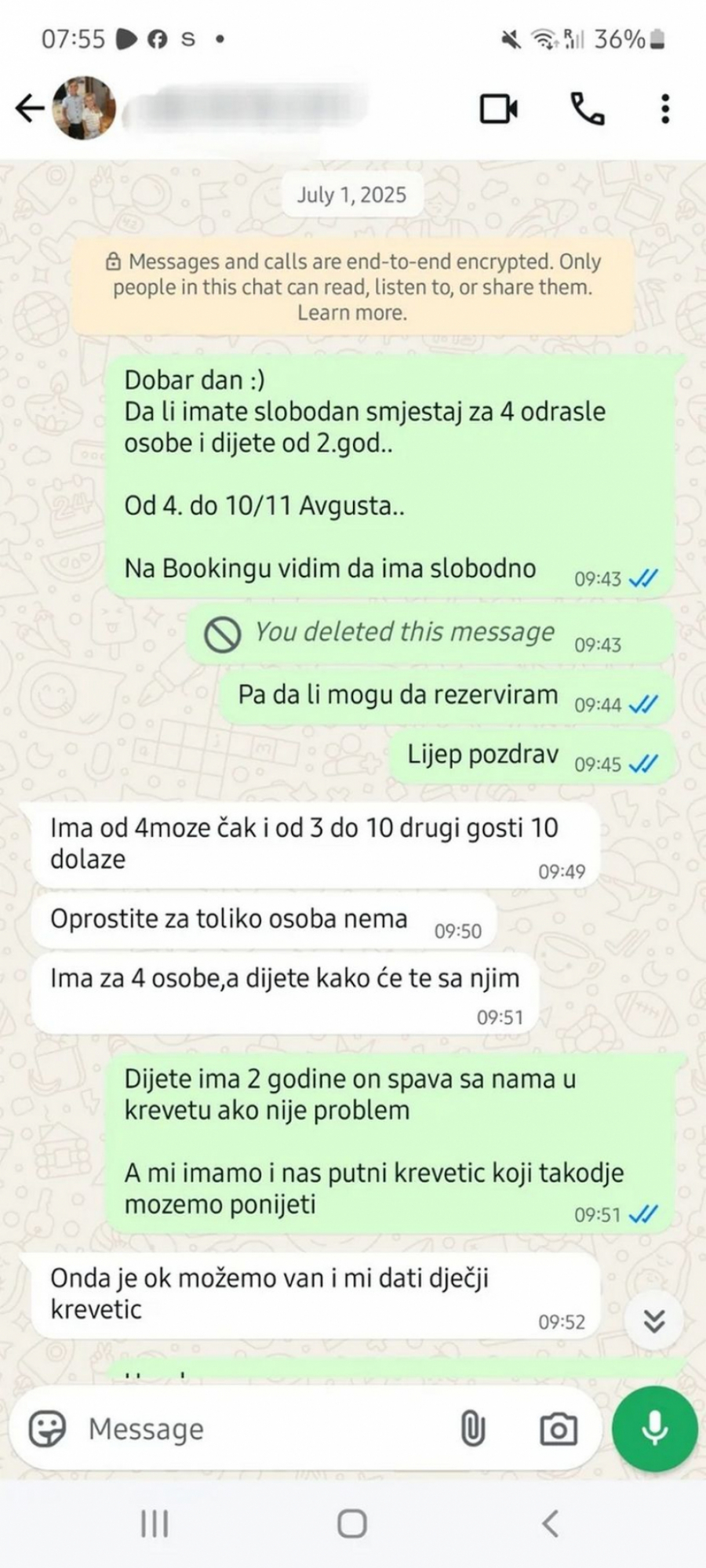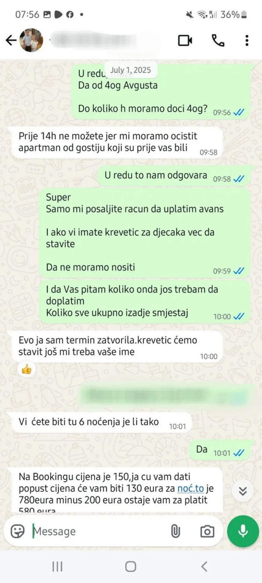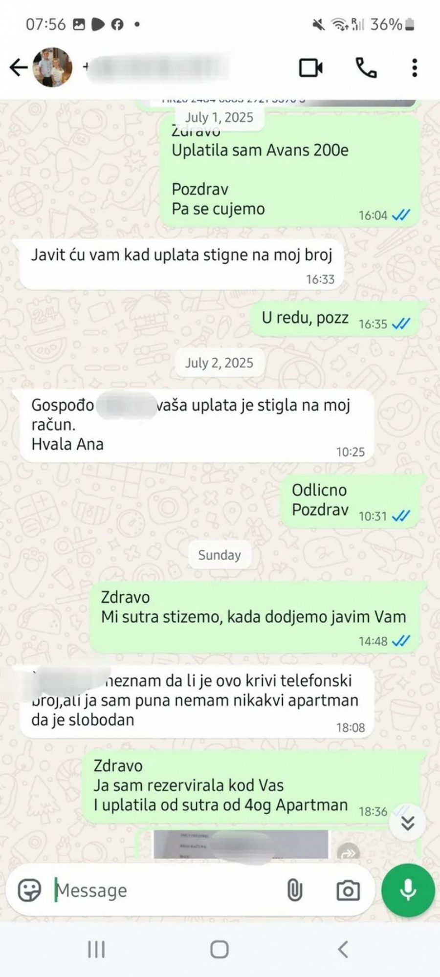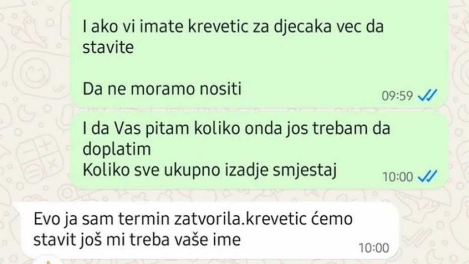 U prepisci koju je podelila uz svoju objavu vidi se da je žena uredno uplatila avans, dobila potvrdu da je uplata legla na račun primaoca i potvrdila da četvoro odraslih i jedno dete dolaze u smeštaj 4. avgusta.