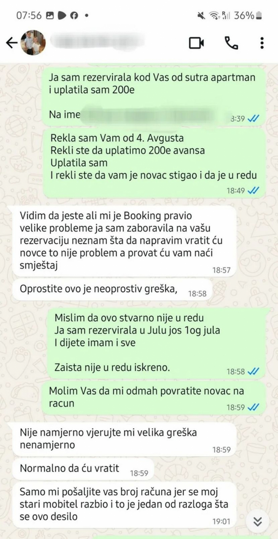 Komunikacija se nastavila gde je žena ponovila da je uredno rezervisala apartman pre mesec dana i da je avans uplatila isti dan.