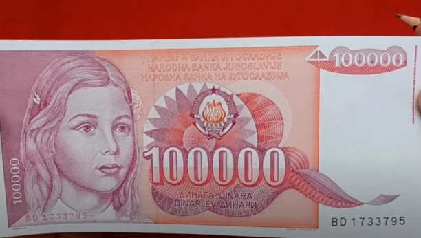 Poslednjih godina socijalističke Jugoslavije, kada je inflacija već uzela maha, 01.06.1989. puštena je u opticaj nova novčanica od 100.000 dinara sa datumom 01.05.1989. Novčanica je imala lik devojke i zbog svoje crvene boje je u delovima bivše Jugoslavije bila poznata kao “crvena“. Na dan puštanja u opticaj, to je bio najveći apoen jugoslovenskog dinara ikada pušten u opticaj.
