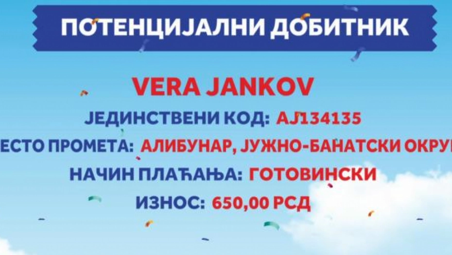 Električni automobil „Fiat Grande Panda“ osvojila je Dijana Ljubičić Zečević. Dobitnica je iz Novog Sada, a svoj račun u iznosu od 650 dinara prijavila je putem mobilne aplikacije. Automobil je izvučen zahvaljujući Suzani Mančić, koja je obavila izvlačenje srećnih dobitnika.