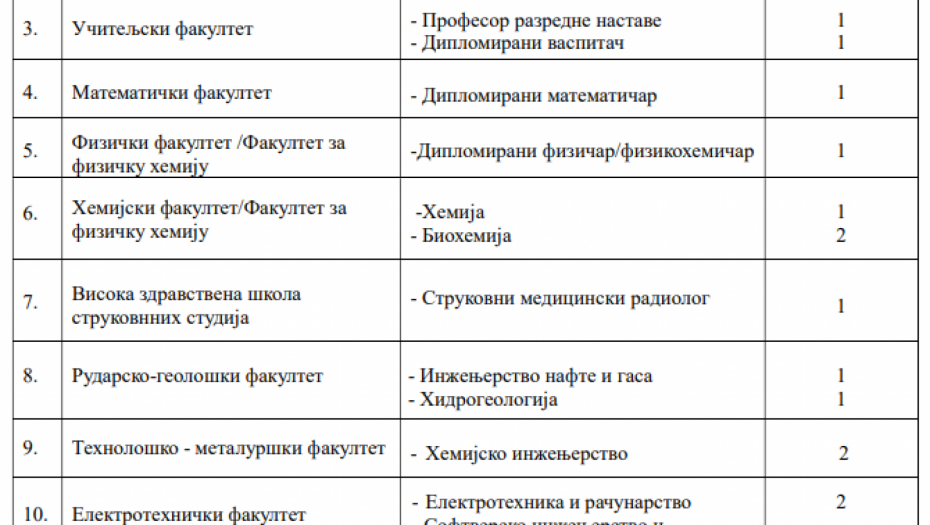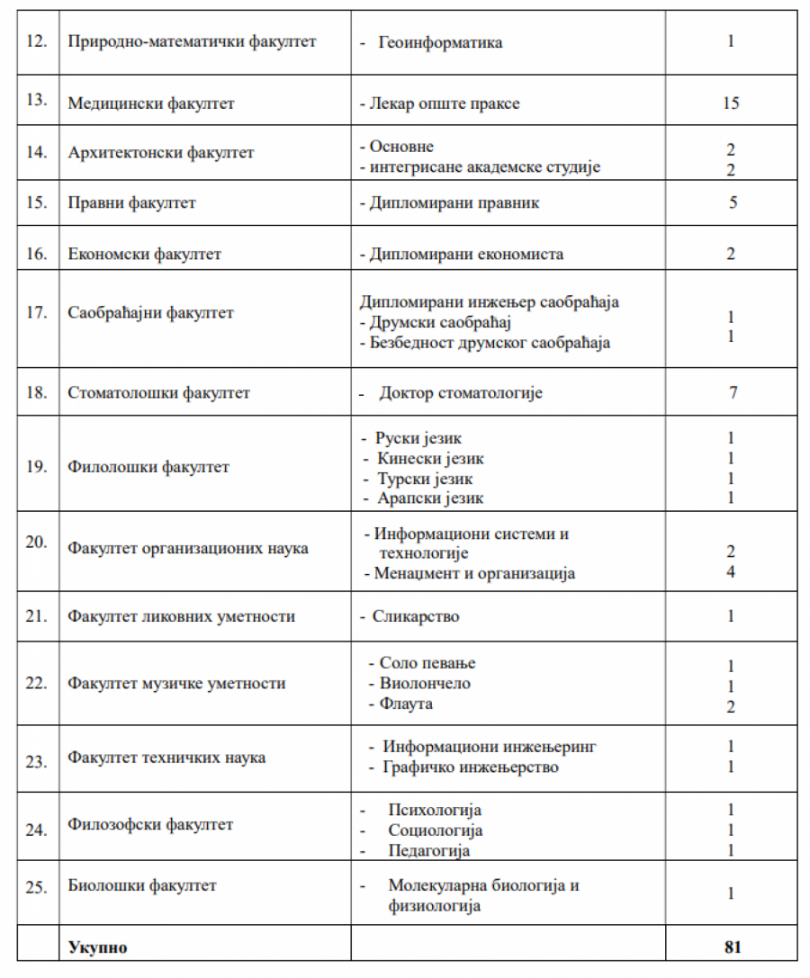 – 81 stipendija namenjena je studentima prvog stepena visokog obrazovanja koji se školuju za deficitarna zanimanja. Među traženim profilima su diplomirani farmaceuti, lekari opšte prakse (15 stipendija), inženjeri elektrotehnike, građevine i mašinstva, kao i profesori matematike i fizike.