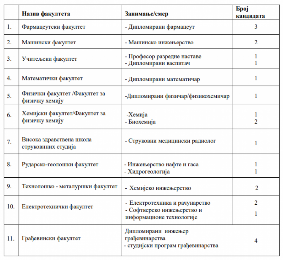Na konkurs se mogu prijaviti studenti od I do V (i VI) godine osnovnih studija i studenti drugog i trećeg stepena studija koji nemaju status apsolventa, nisu u radnom odnosu, koji su odmah po završetku osnovnih studija nastavili studije drugog ili trećeg stepena i ukoliko ispunjavaju ostale uslove u skladu sa zakonom i odlukom.