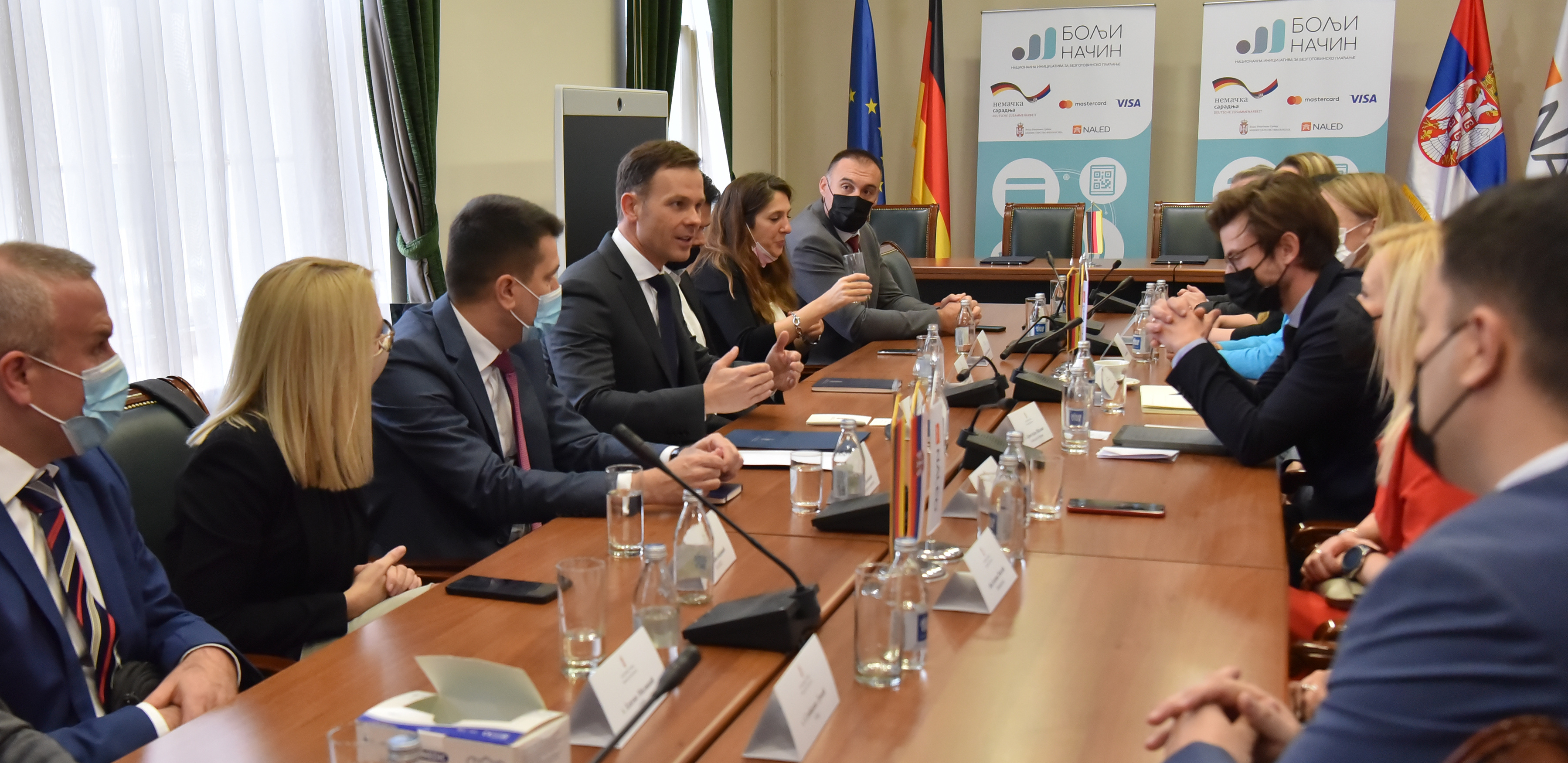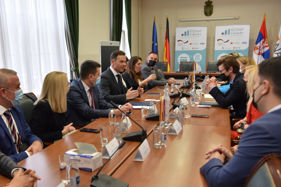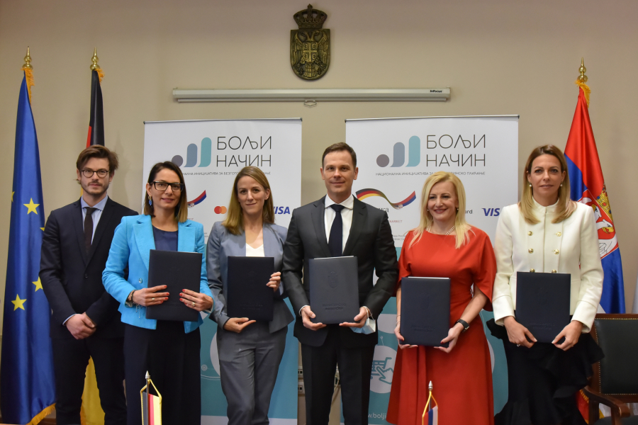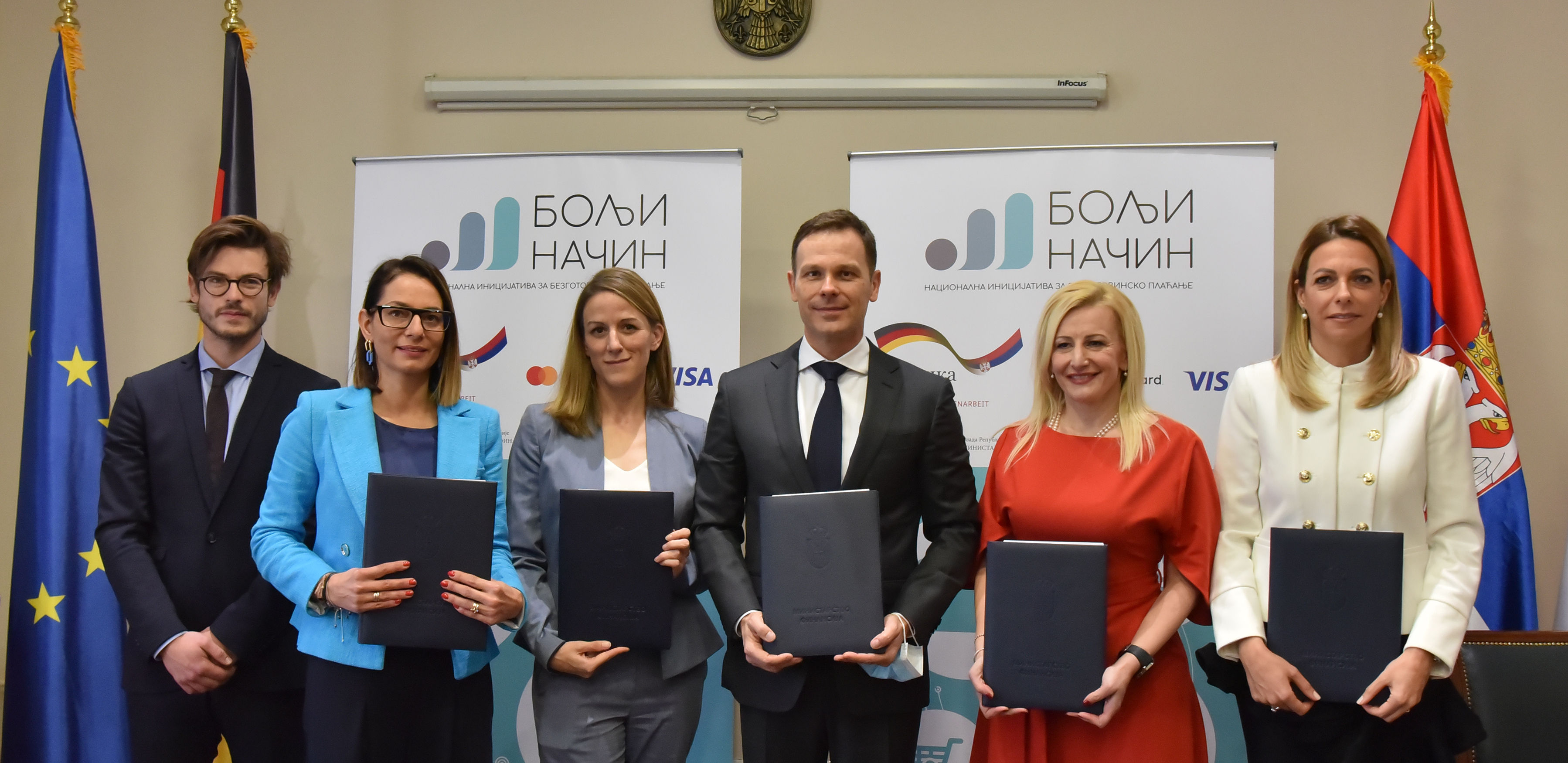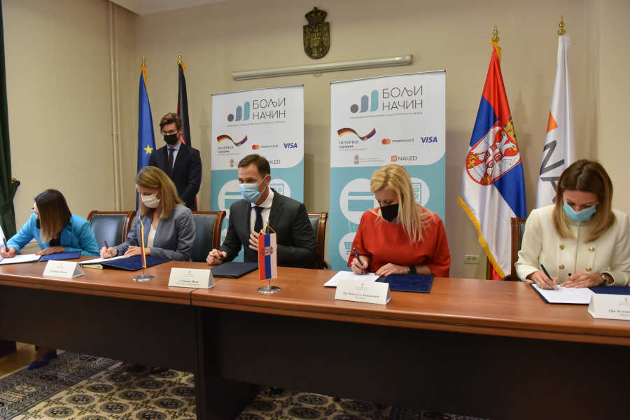 Ministar finansija Siniša Mali i predstavnici Nemačke razvojne saradnje (GIZ), NALED-a, i kompanija VISA i Masterkard potpisali su danas u Ministarstvu finansija Sporazum o saradnji kojim je zvanično lansirana Nacionalna inicijativa za bezgotovinsko plaćanje, projekat podrške malim trgovcima i institucijama da modernizuju svoje poslovanje i omoguće građanima bolji i sigurniji način plaćanja – karticom ili mobilnim telefonom – u radnjama, ugostiteljskim objektima, i na šalterima širom Srbije.
