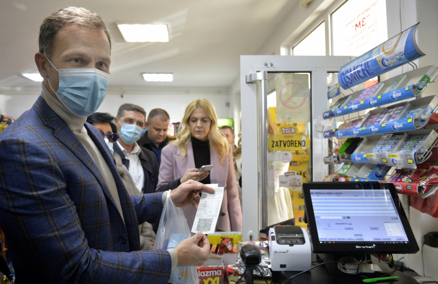 Nakon simbolične kupovine, ministar Mali je proverio fiskalni račun skeniranjem QR koda na telefonu, a potom je sa direktorkom Poreske uprave i vlasnicom prodavnice Sonjom Nikolić zalepio nalepnicu na izlog, koja potvrđuje da je prodavnica eFiskalizovana.