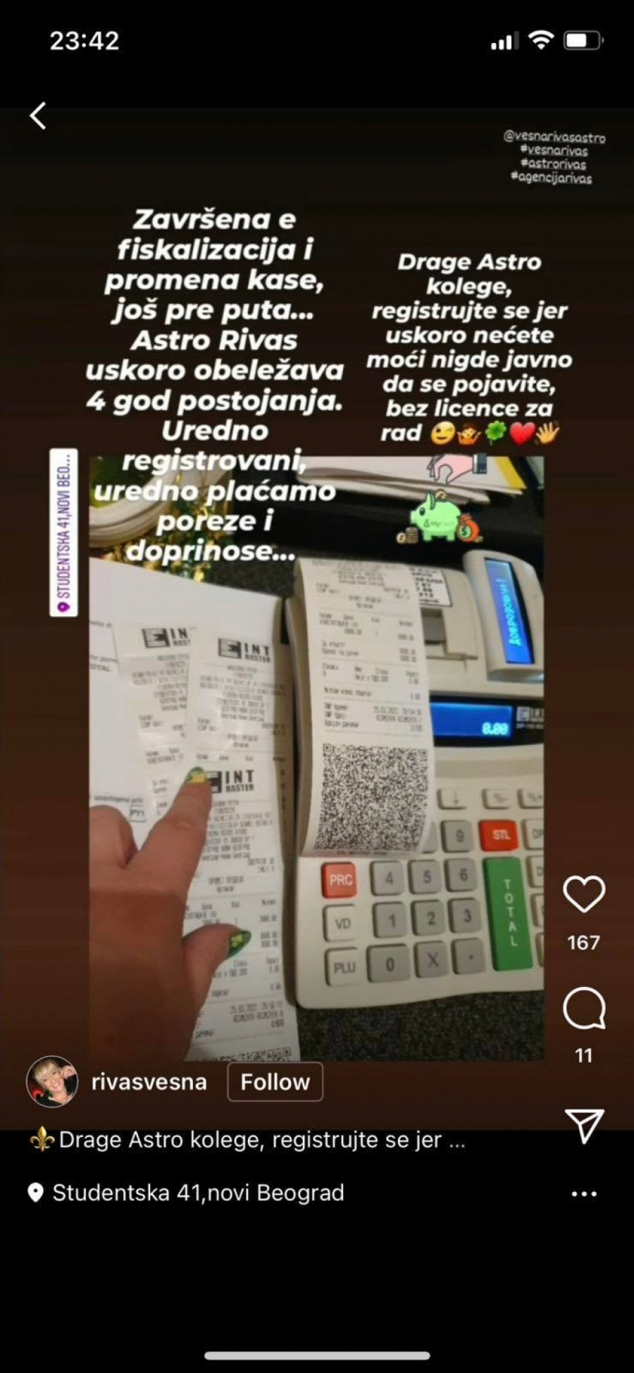 - Završena e-fiskalizacija i promena kase, još pre puta... Astro Rivas uskoro obeležava 4 god postojanja. Uredno registrovani, uredno plaćamo poreze i doprinose... Drage Astro kolege, registrujte se jer uskoro nećete moći nigde dajvno da se pojavite, bez licence za rad. - napisala je Rivas na Instagram storiju.