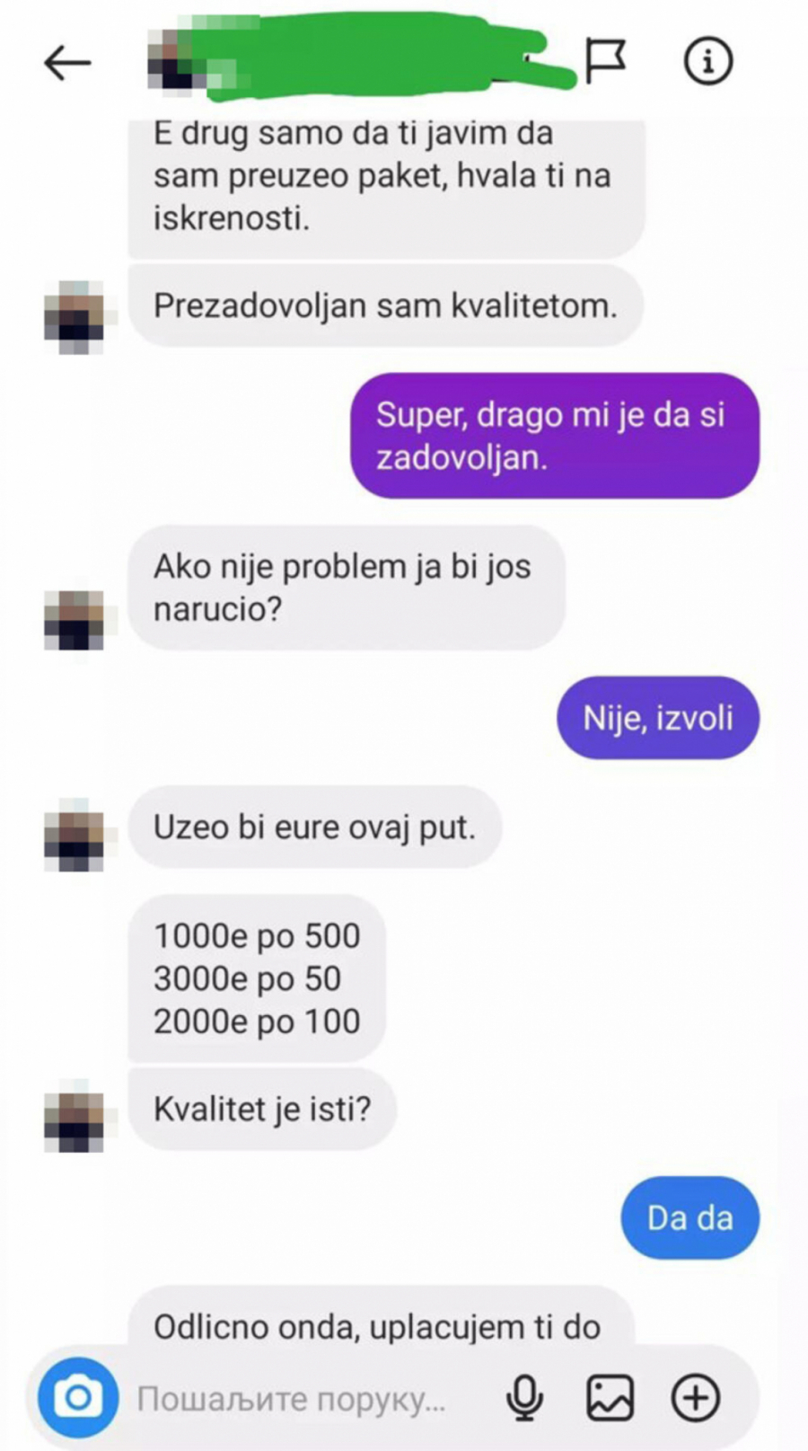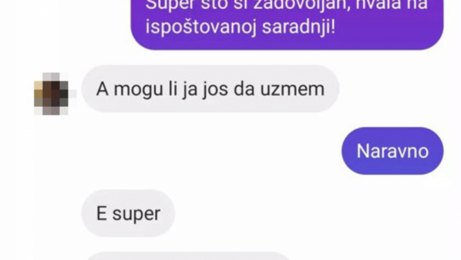 - Buraz, odrađeno je fantastično, ja sam u šoku, prešao si igricu. Sutra ću sve da utopim pa se javljam za još - piše mušterija.