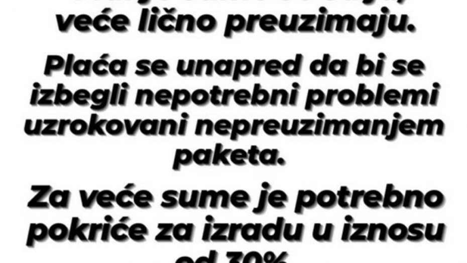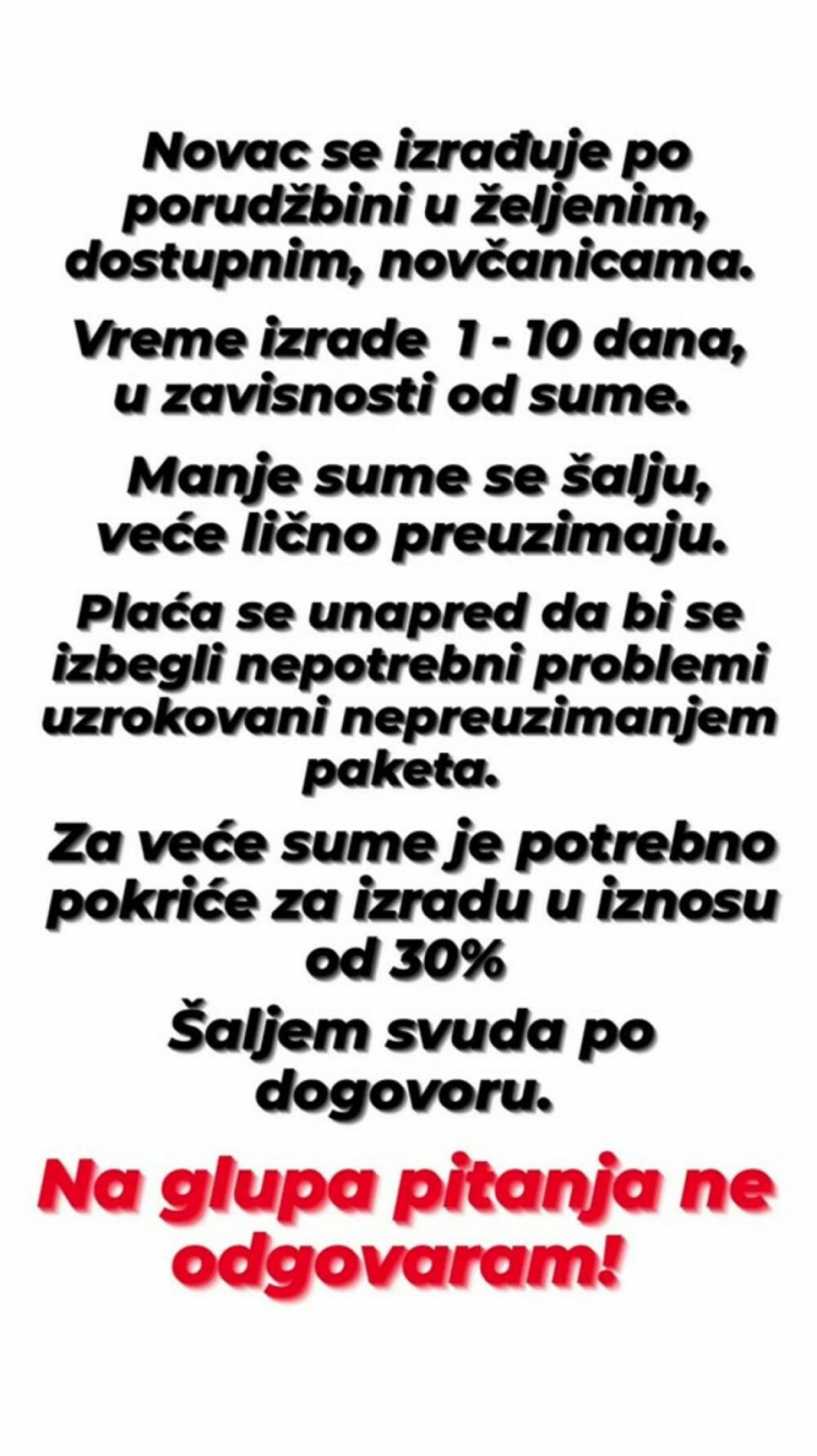- Novac se izrađuje po porudžbini u željenim novčanicama. Vreme izrade je od jednog do 10 dana u zavisnosti od sume. Manje sume se šalju dok se veće lično preuzimaju. Plaća se unapred da bi se izbegli nepotrebni problemi uzrokovani nepreuzimanjem paketa. Za veće sume je potrebno pokriće za izradu u iznosu od 30 odsto - stoji u jednom od oglasa na Instagram profilu "Balkan banka" koji prati više od 10.000 ljudi.