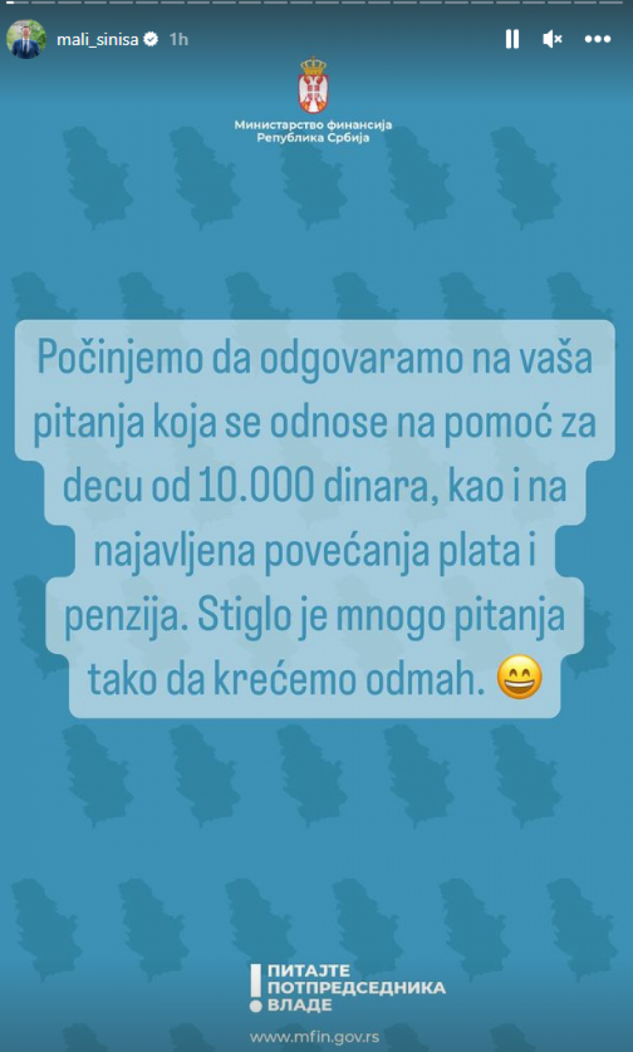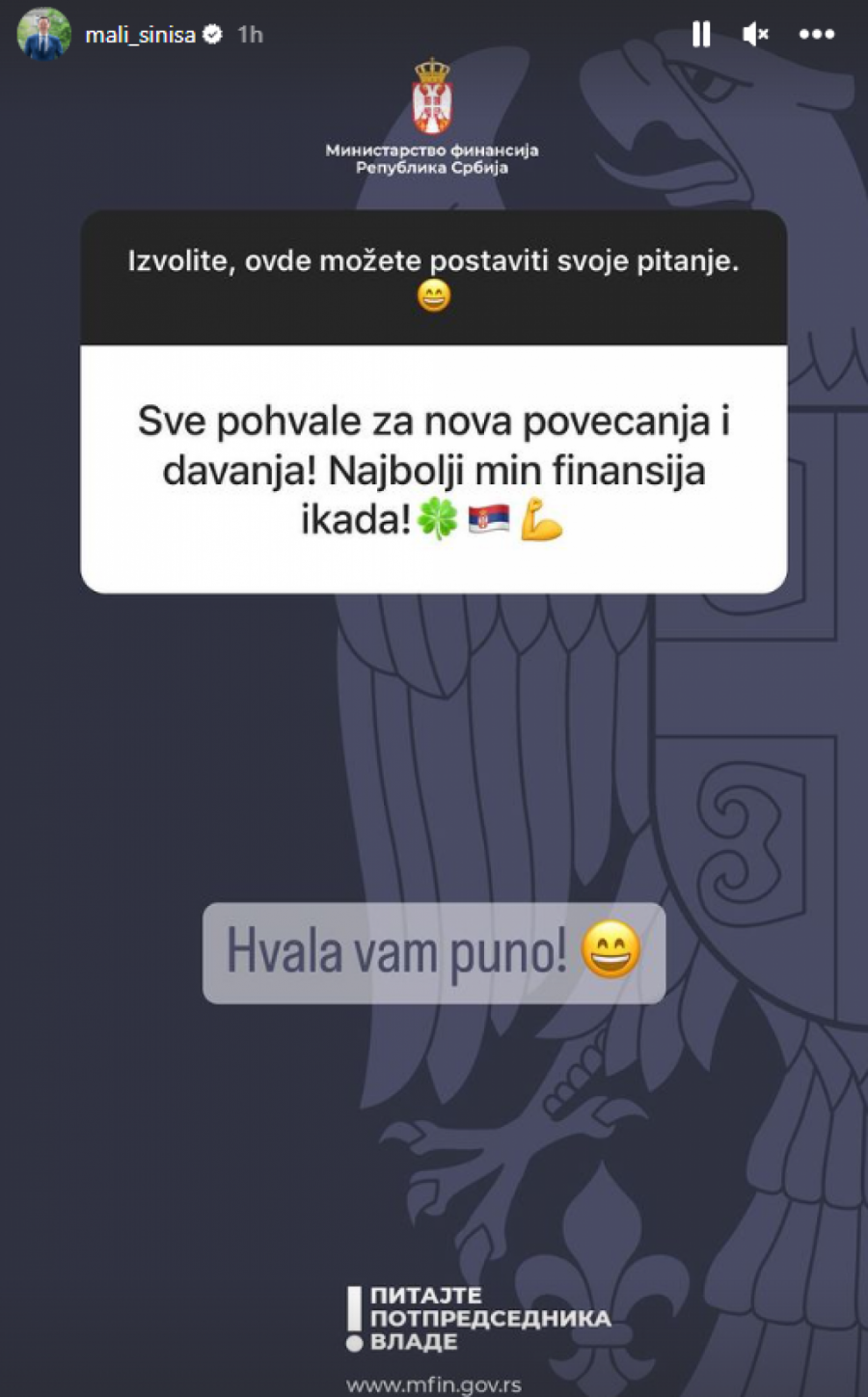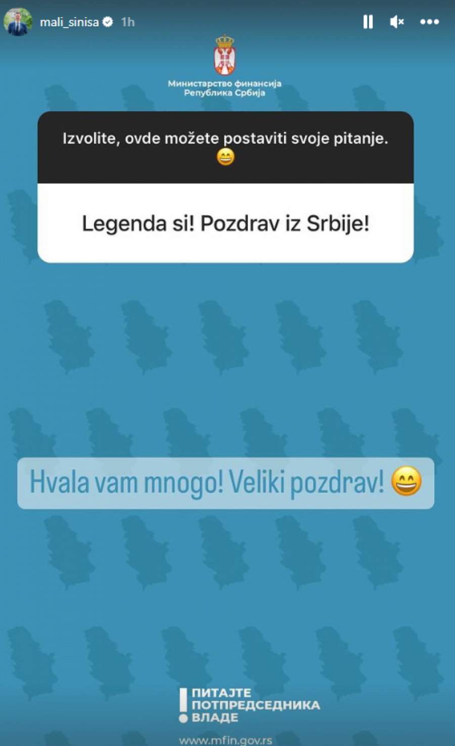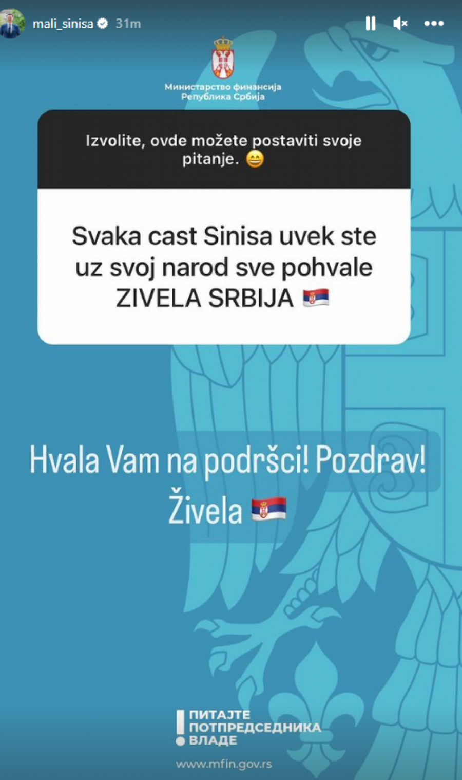 Građani su mogli da postave pitanja putem ankete koja je već postavljena na Instagram storiju na profilu Siniše Malog, a ministar je podelio svoje odgovore.