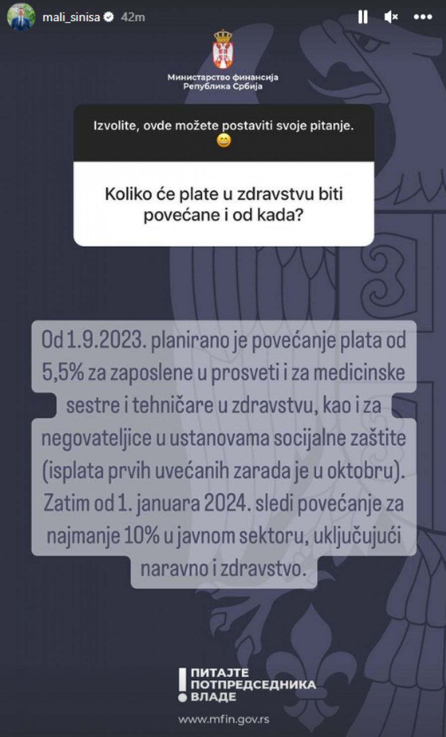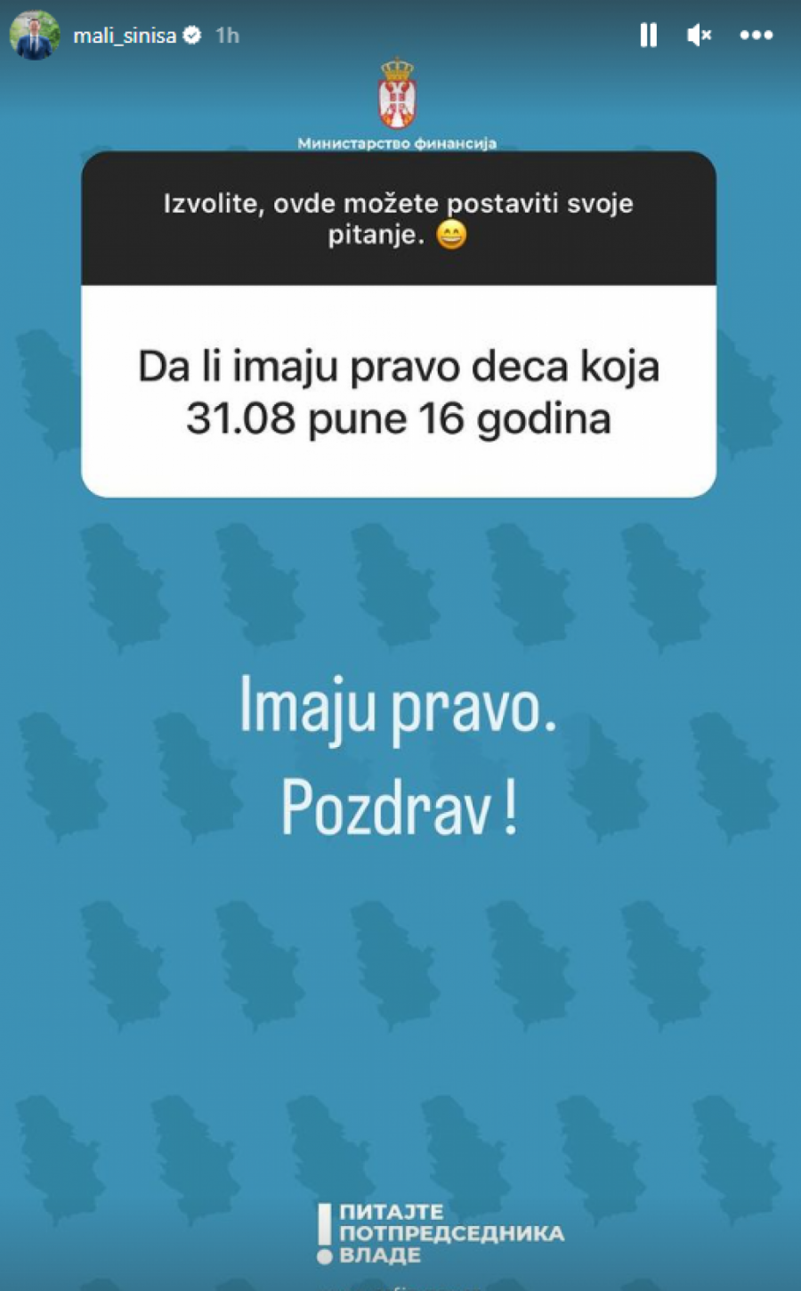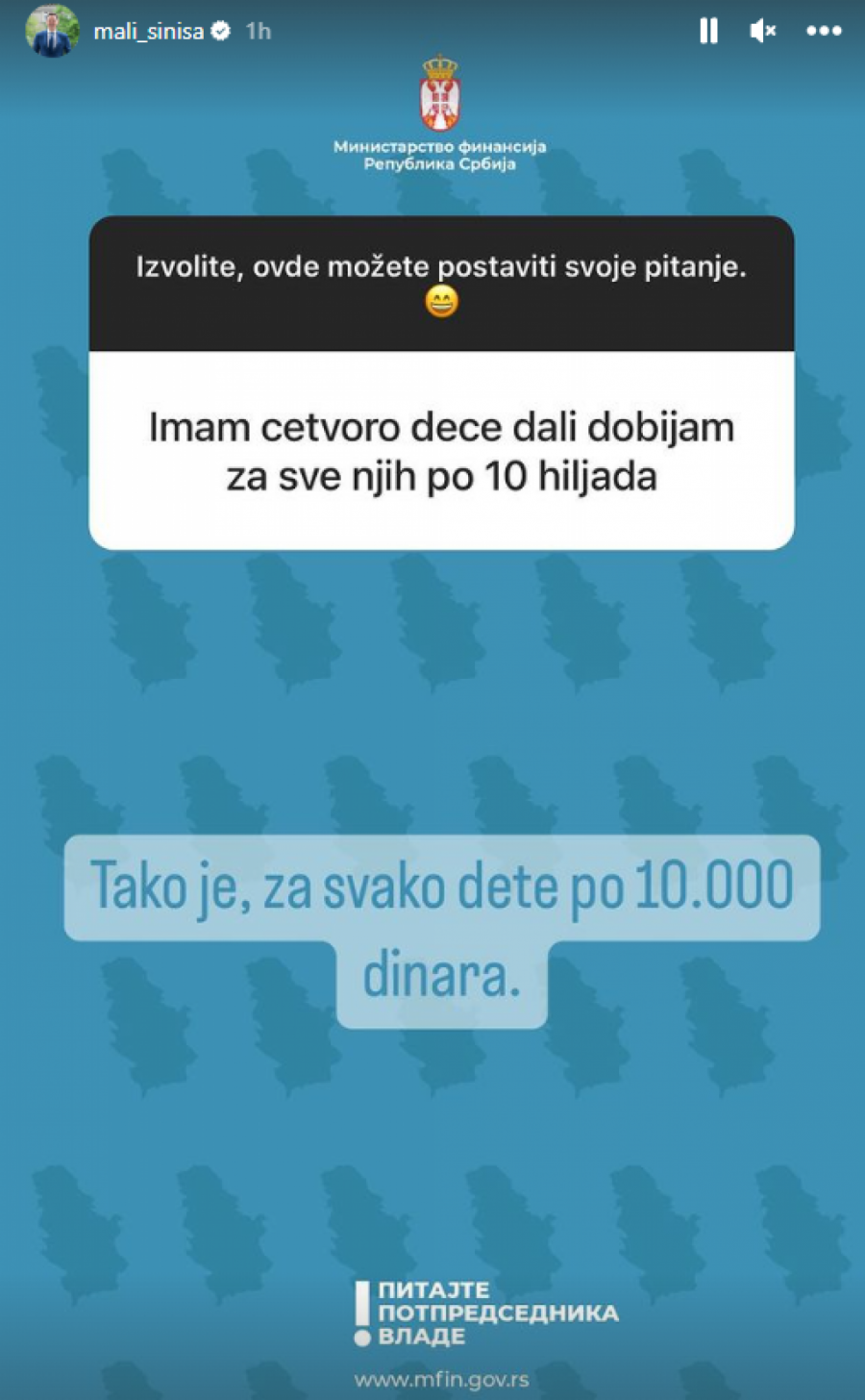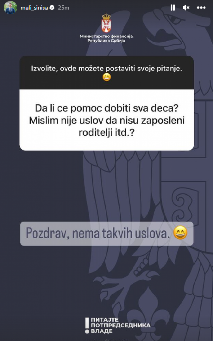 Građani su mogli da postave pitanja putem ankete koja je već postavljena na Instagram storiju na profilu Siniše Malog, a ministar je podelio svoje odgovore.