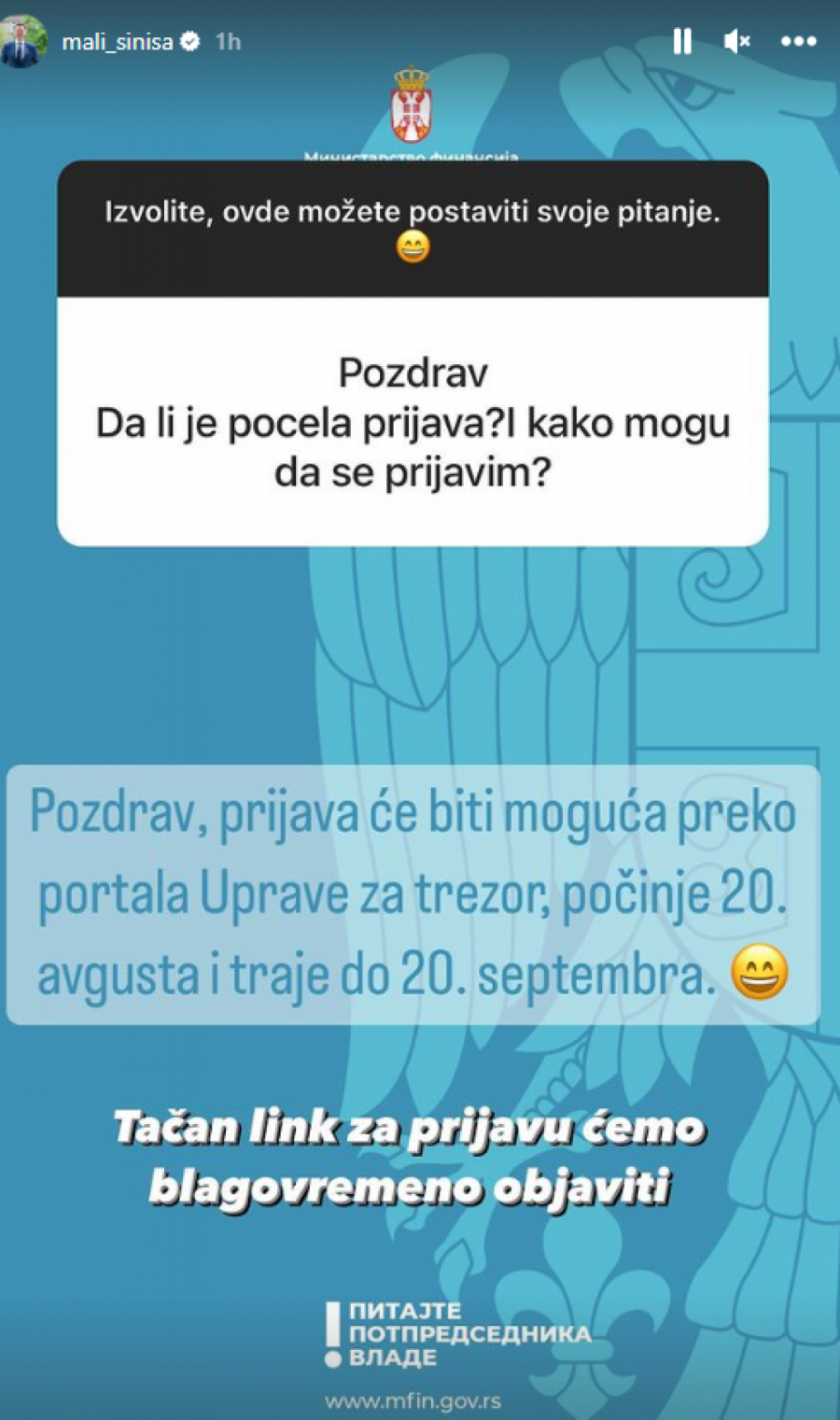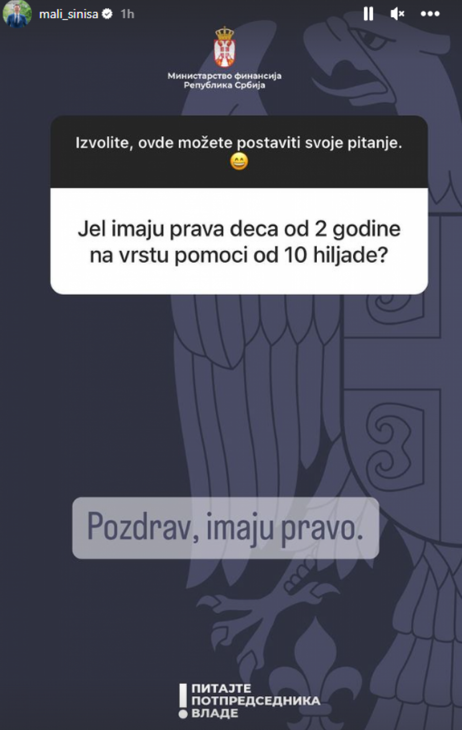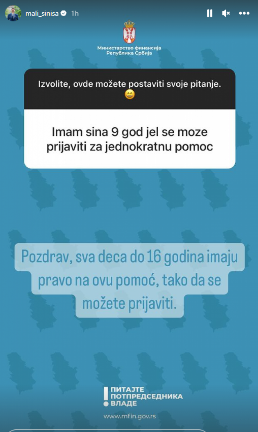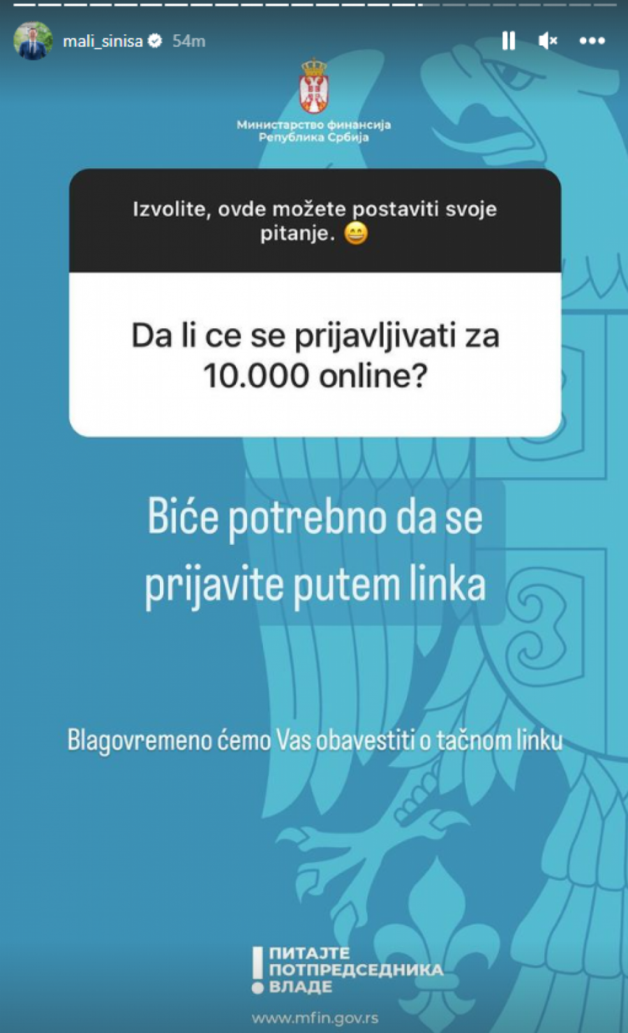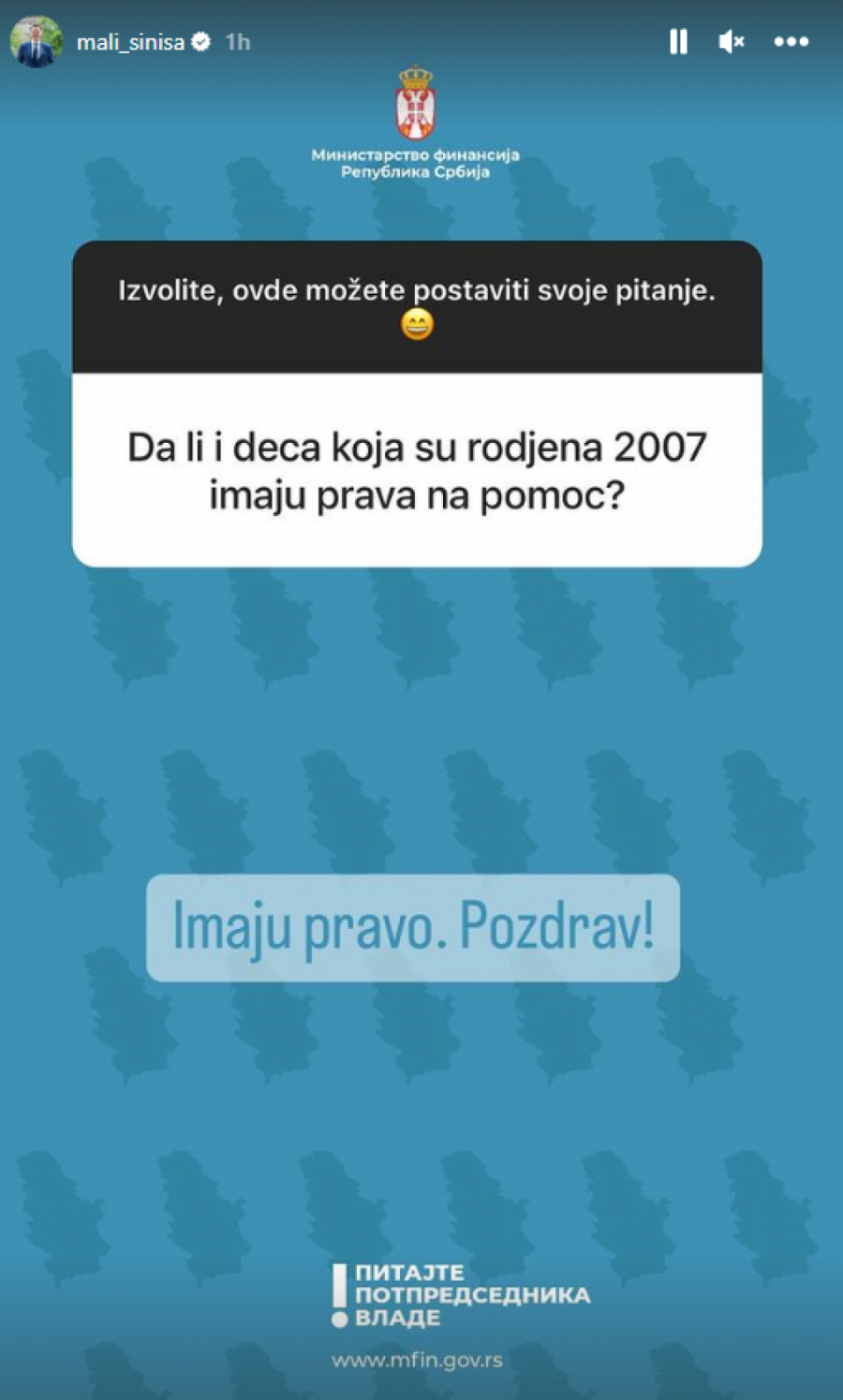 Građani su mogli da postave pitanja putem ankete koja je već postavljena na Instagram storiju na profilu Siniše Malog, a ministar je podelio svoje odgovore.