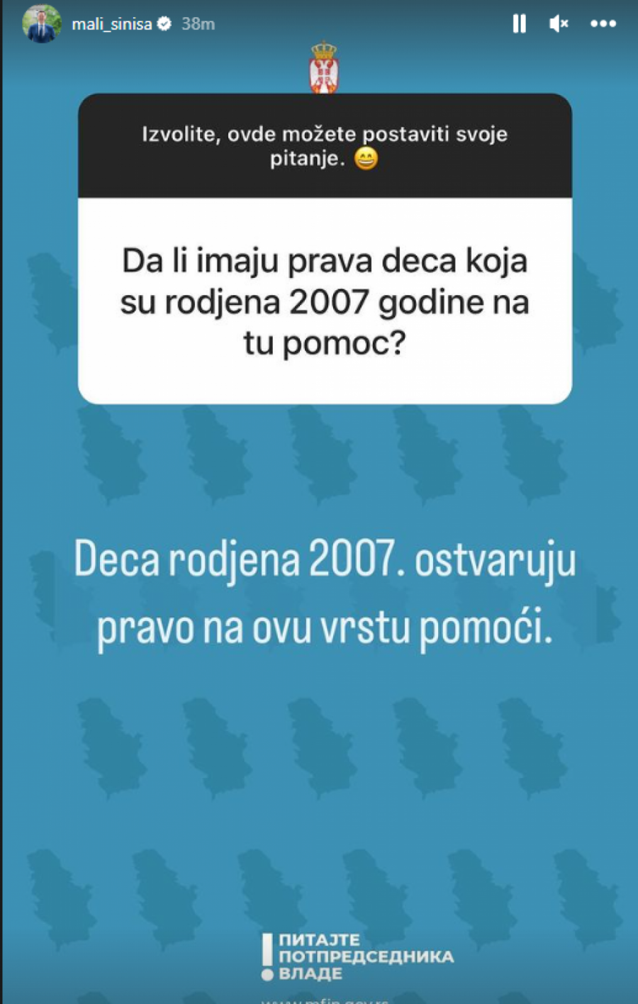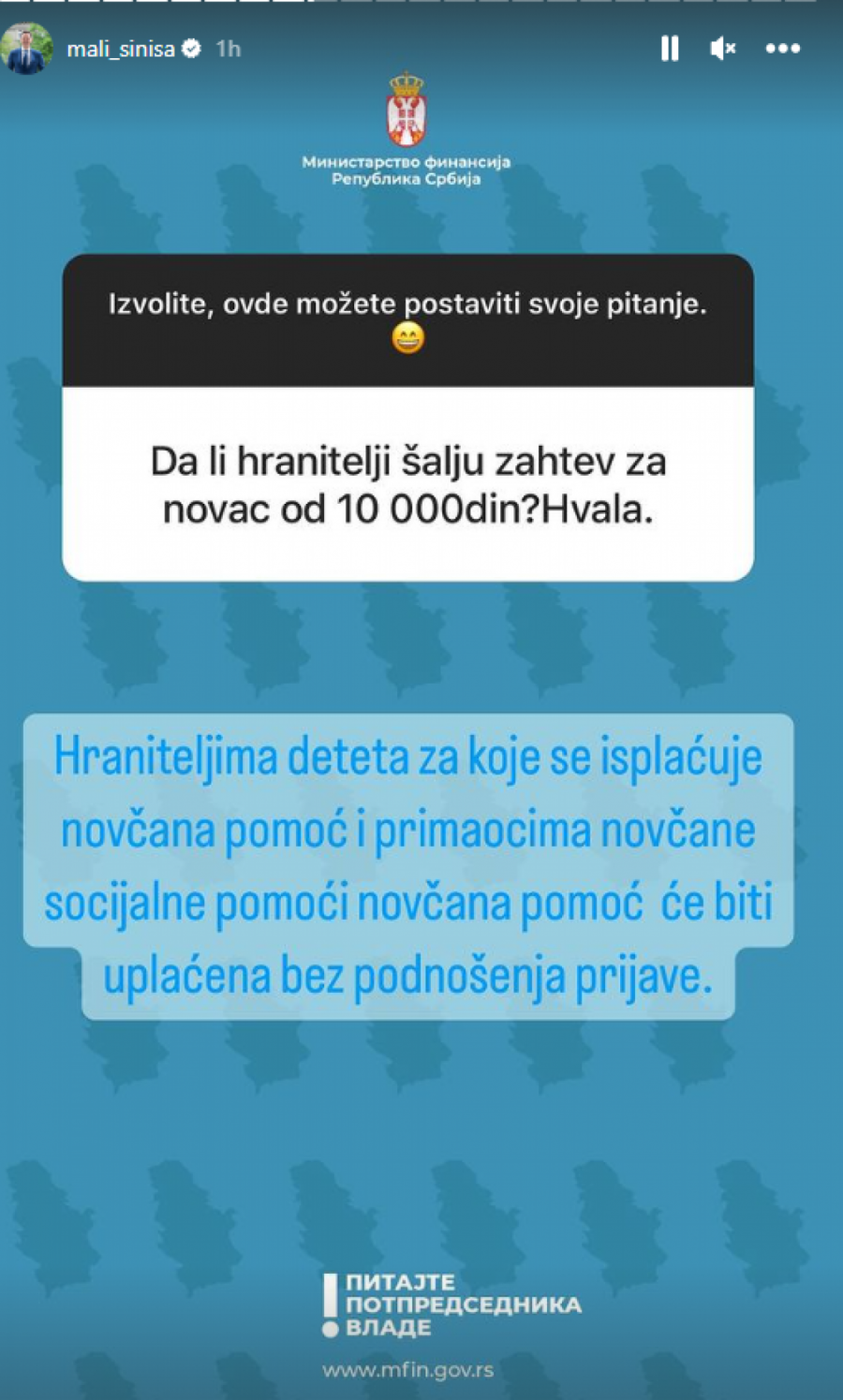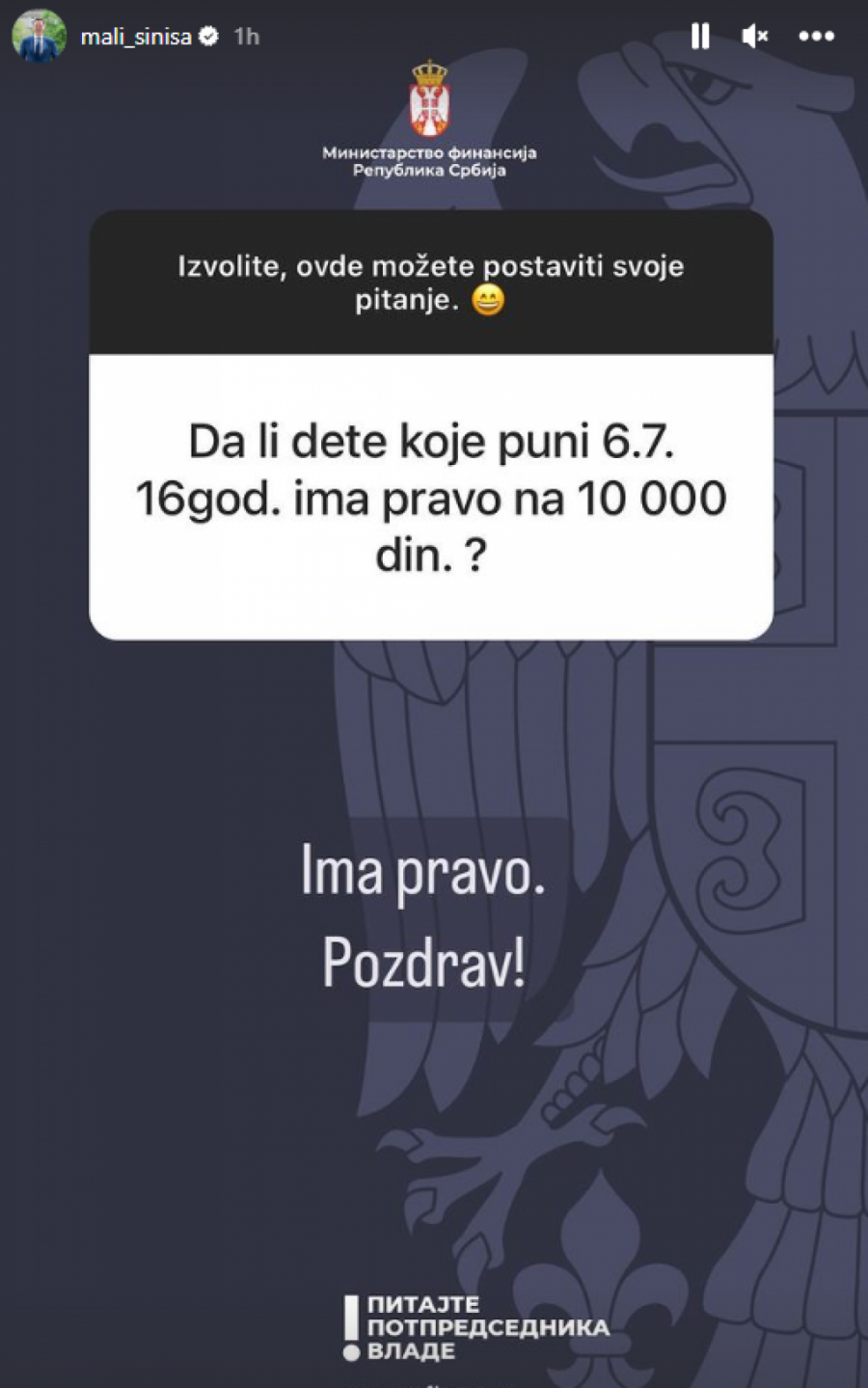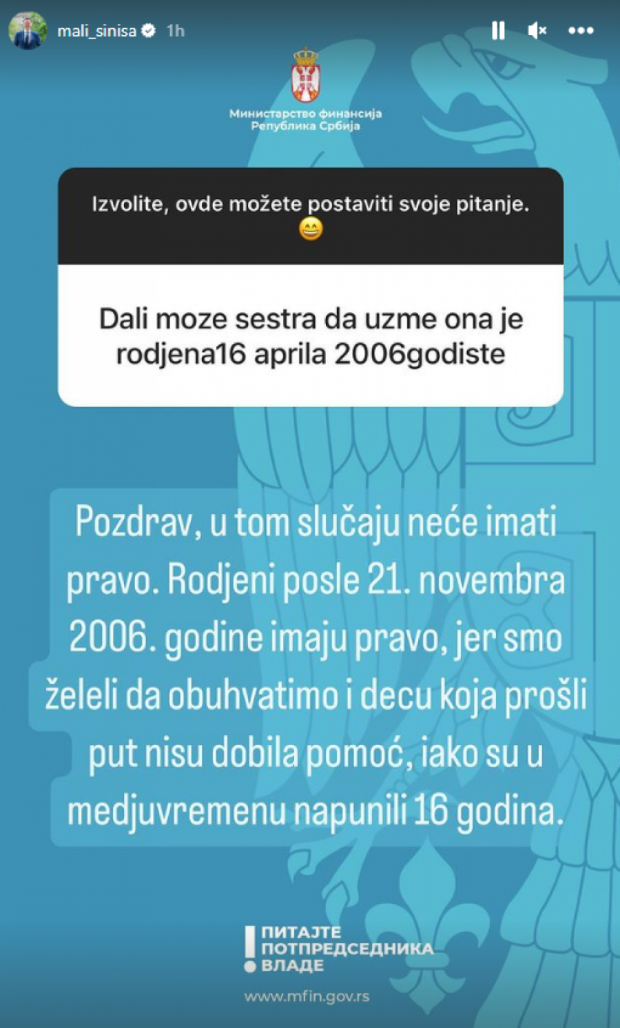 Građani su mogli da postave pitanja putem ankete koja je već postavljena na Instagram storiju na profilu Siniše Malog, a ministar je podelio svoje odgovore.