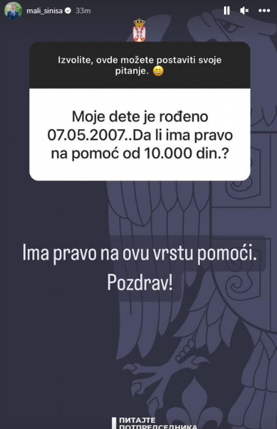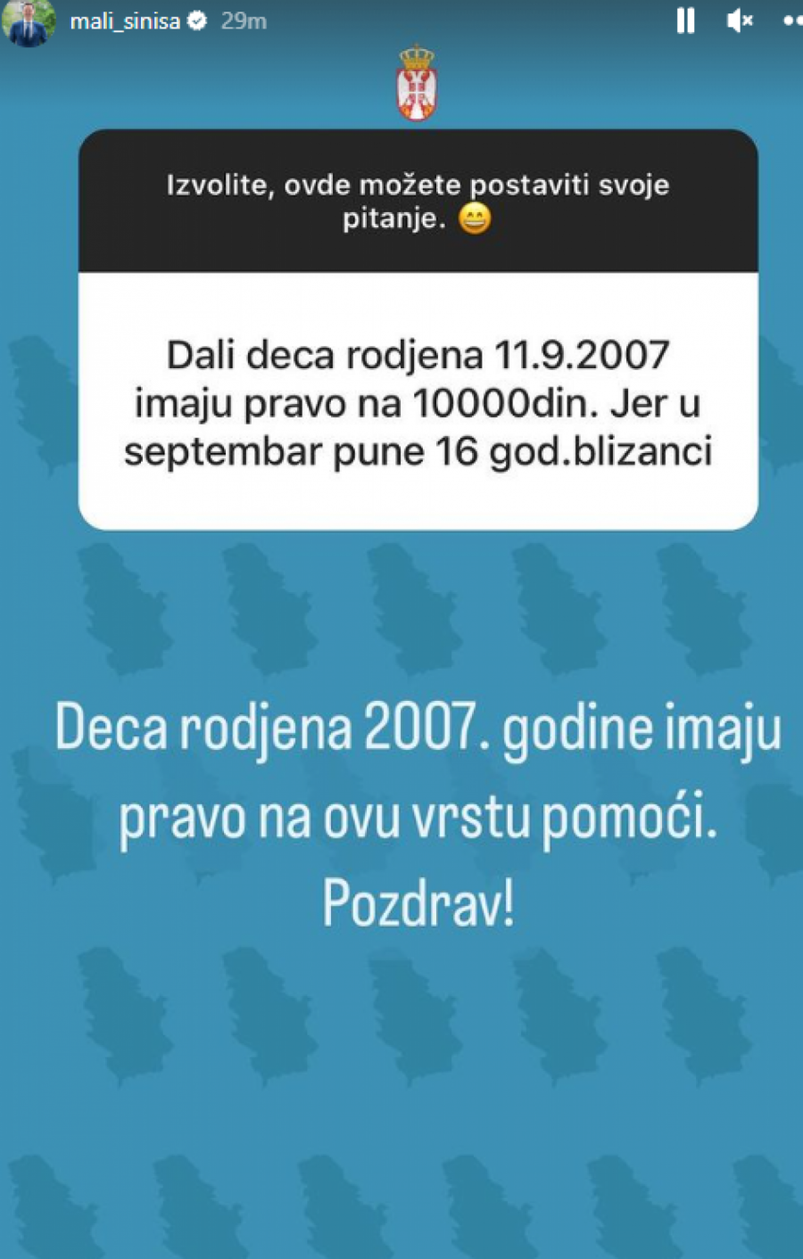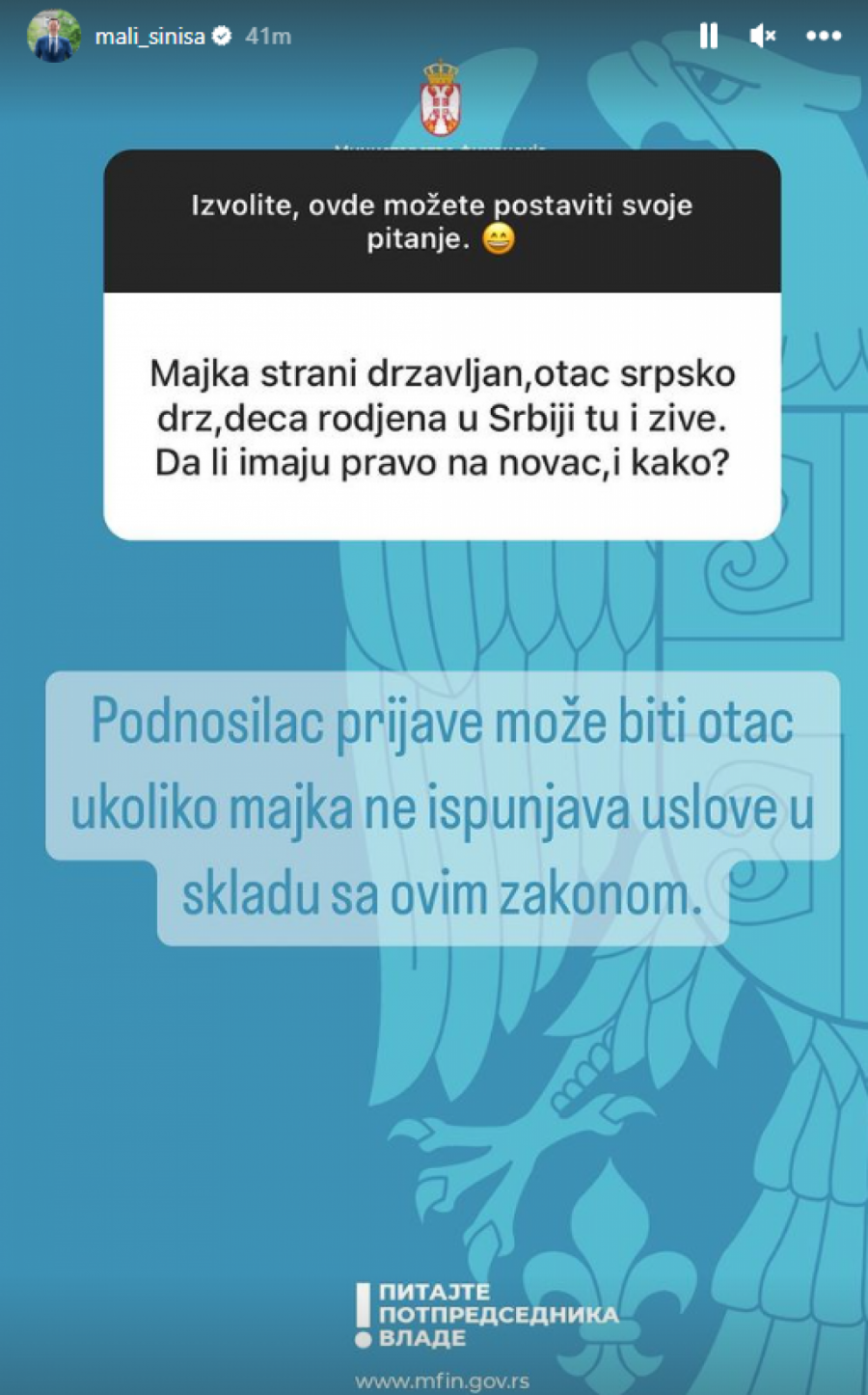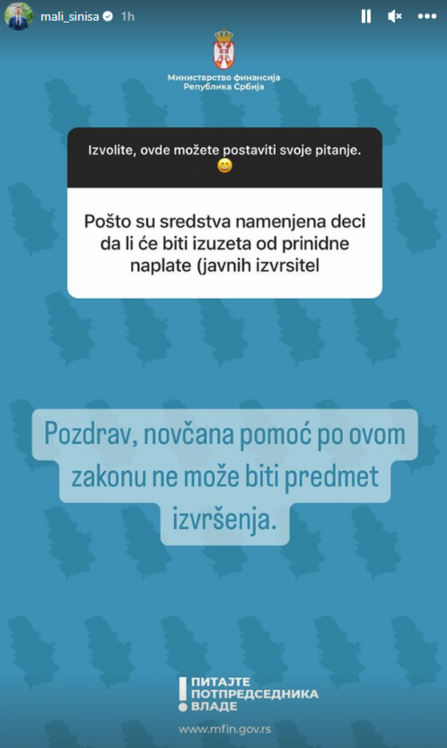 Građani su mogli da postave pitanja putem ankete koja je već postavljena na Instagram storiju na profilu Siniše Malog, a ministar je podelio svoje odgovore.