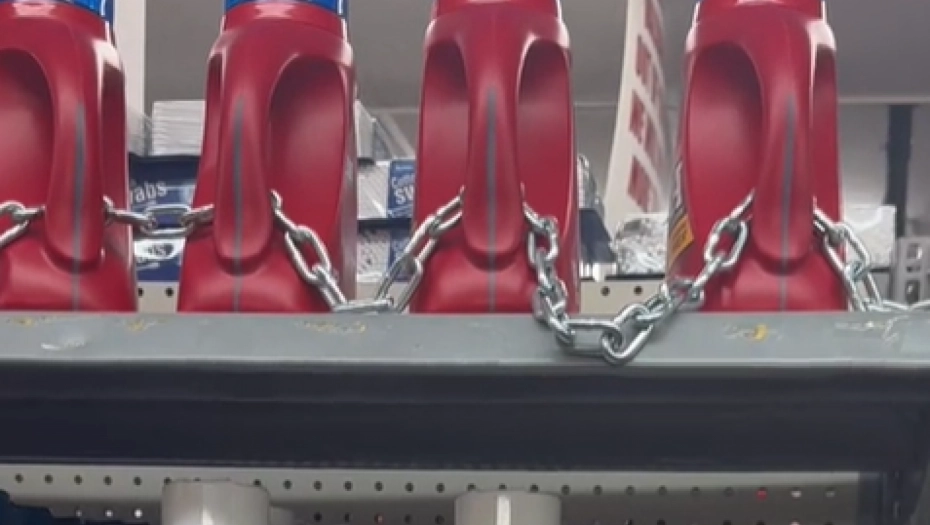 Jedna američka prodavnica mešovite robe odlučila je lancima i katancima opasati boce deterdženata na policama kako bi sprečila ljude da ih ukradu.