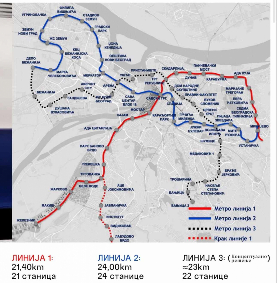 Vesić je rekao da prva linija metroa počinje u Železniku i ide na Makiš, Žarkovo, Bele vode, Požešku ulicu, Trgovačku, pa na Adu ciganliju odakle ide do Sajma, zatim Bulevarom vojvode Mišića i Savskom ulicom do Savskog trga gde se ukršta sa drugom linijom metroa. Odatle će metro, dodao je, ići na Trg Republike, pa se spušta na Skadarliju prema Luci Beograd, Adi Huji i Pančevačkom mostu odakle ide na Karaburmu i Mirijevo.