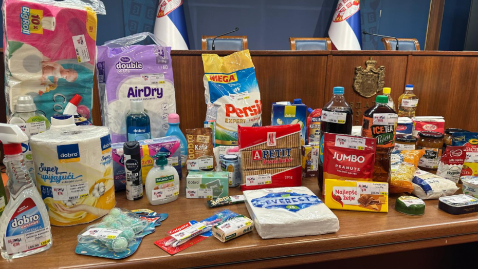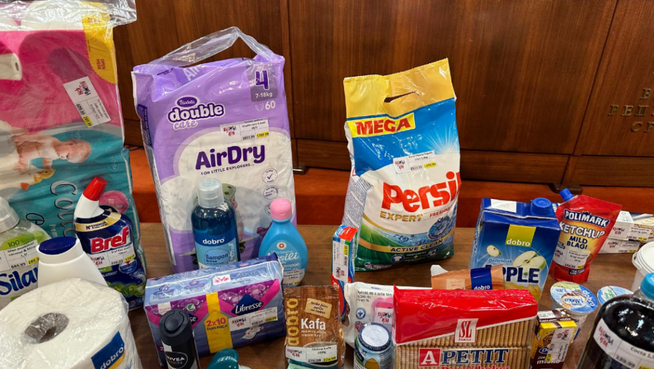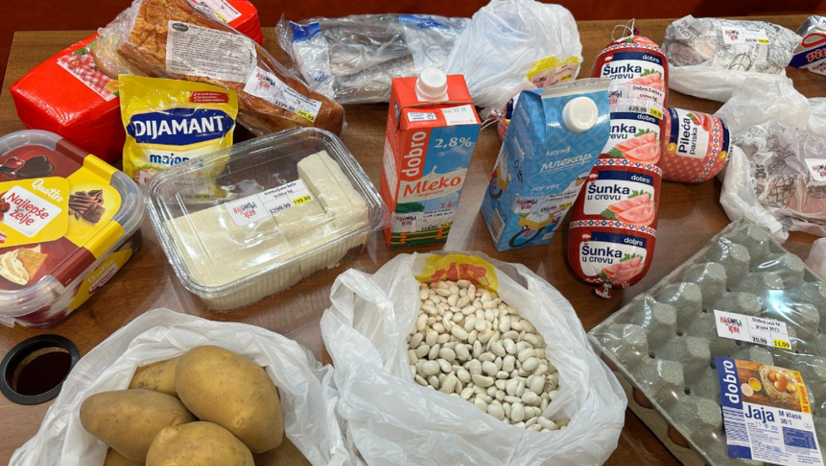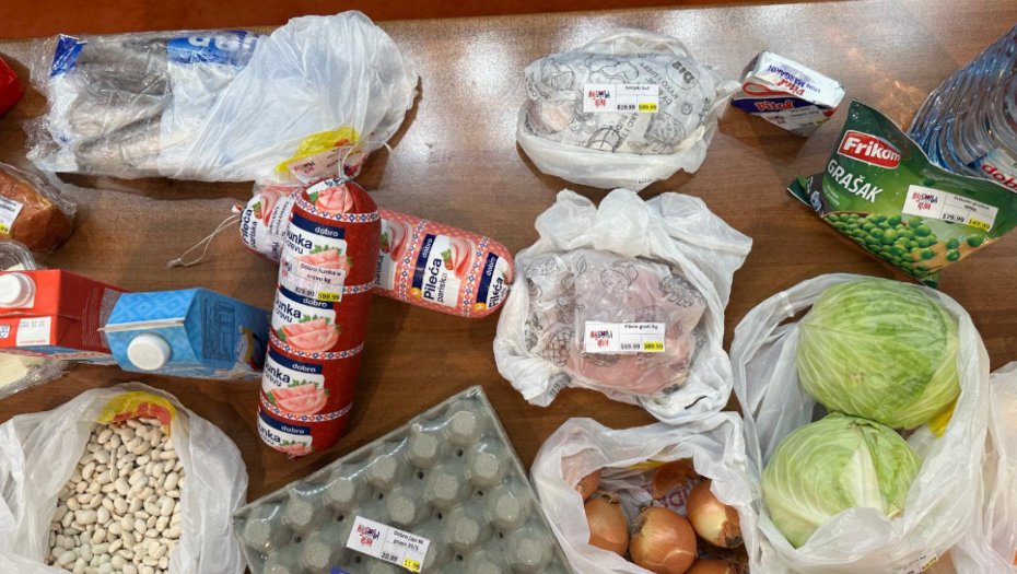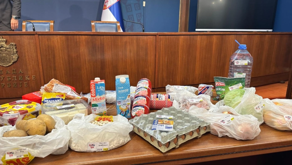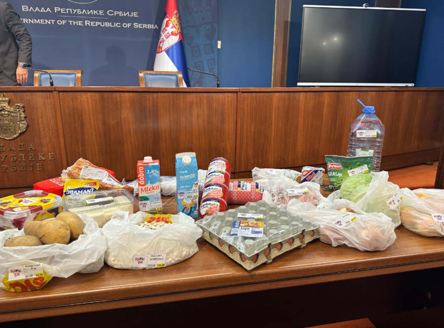 - Piletina, svinjska mast, svinjsko meso (jedan artikal minimalno), riba (sveža ili smrznuta), mleko dugotrajno 2,8%mm 1l, jogurt 2,8%mm 1l, sir kriška kg, kiselo mleko, margarin, sirni namaz, jaja, pavlaka, žuti sir (edamer, gauda, kačkavalj), čokoladno mleko, pariska kobasica (parizer), pileća viršla, stišnjena šunka, suva svinjska pečenica ili suvi svinjski vrat, testenina ili špagete, brašno tip 400 - kg, brašno tip 500 - 1kg, suncokretovo ulje 1l, pirinač, sirće, krompir beli kg, jabuka kilogram, luk crni kilogram, pasulj kilogram, kupus kilogram, tradicionalna kafa 200gr, čaj, instant kafa, čokolada, bombone tvrde, keks, kikiriki, pašteta, tunjevina, sardina, majnoze, kečap, humus, sok jabuka 2l, balon negazirane vode (5l ili 6l), gazirani sok, ledeni čaj, džem, mešana salata u tegli, med, grašak smrznuti, sladoled porodično pakovanje, začin za hranu, mlevena paprika, supe u kesici, puding u kesici, dečji šampon, pelene za bebe, kašica za bebe, papir za pečenje, ubrus, deterdžent za posuđe, deterdžent za veš, omekšivač za veš, sanitar za čišćenje, osveživač WC šolje, sredstvo za čišćenje stakla, abraziv gel, sredstvo za skidanje kamenca, šampon za kosu, gel za tuširanje, ulošci za žene, pasta za zube, sapun tvrdi za ruke, tečni sapun, vlažne maramice, dezorodorans ili rol-on, četkica za zube, sredstvo za brijanje, toalet dvoslojni ili troslojni, salvete, suva hrana za životinje.