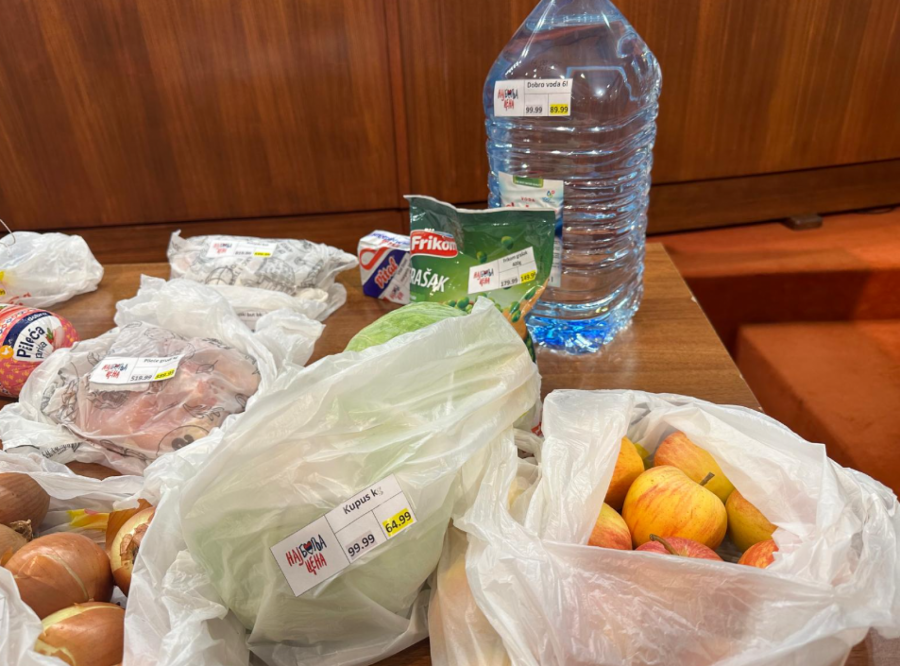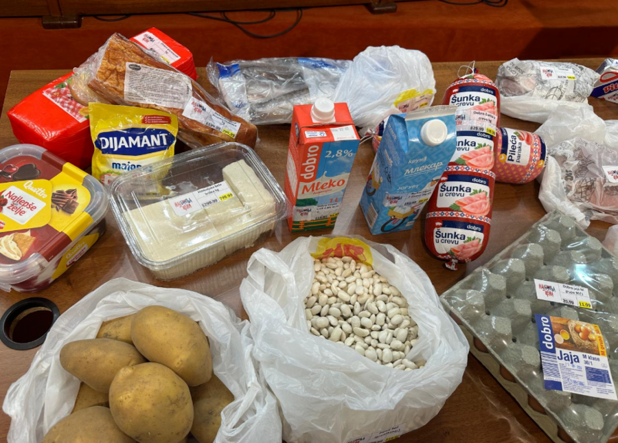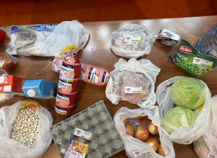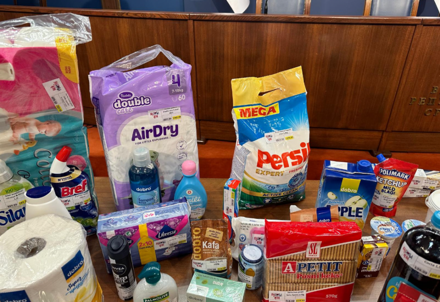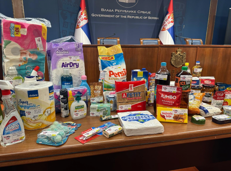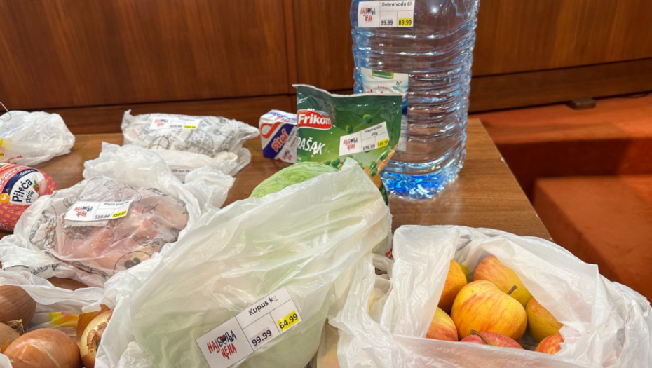 - Piletina, svinjska mast, svinjsko meso (jedan artikal minimalno), riba (sveža ili smrznuta), mleko dugotrajno 2,8%mm 1l, jogurt 2,8%mm 1l, sir kriška kg, kiselo mleko, margarin, sirni namaz, jaja, pavlaka, žuti sir (edamer, gauda, kačkavalj), čokoladno mleko, pariska kobasica (parizer), pileća viršla, stišnjena šunka, suva svinjska pečenica ili suvi svinjski vrat, testenina ili špagete, brašno tip 400 - kg, brašno tip 500 - 1kg, suncokretovo ulje 1l, pirinač, sirće, krompir beli kg, jabuka kilogram, luk crni kilogram, pasulj kilogram, kupus kilogram, tradicionalna kafa 200gr, čaj, instant kafa, čokolada, bombone tvrde, keks, kikiriki, pašteta, tunjevina, sardina, majnoze, kečap, humus, sok jabuka 2l, balon negazirane vode (5l ili 6l), gazirani sok, ledeni čaj, džem, mešana salata u tegli, med, grašak smrznuti, sladoled porodično pakovanje, začin za hranu, mlevena paprika, supe u kesici, puding u kesici, dečji šampon, pelene za bebe, kašica za bebe, papir za pečenje, ubrus, deterdžent za posuđe, deterdžent za veš, omekšivač za veš, sanitar za čišćenje, osveživač WC šolje, sredstvo za čišćenje stakla, abraziv gel, sredstvo za skidanje kamenca, šampon za kosu, gel za tuširanje, ulošci za žene, pasta za zube, sapun tvrdi za ruke, tečni sapun, vlažne maramice, dezorodorans ili rol-on, četkica za zube, sredstvo za brijanje, toalet dvoslojni ili troslojni, salvete, suva hrana za životinje.