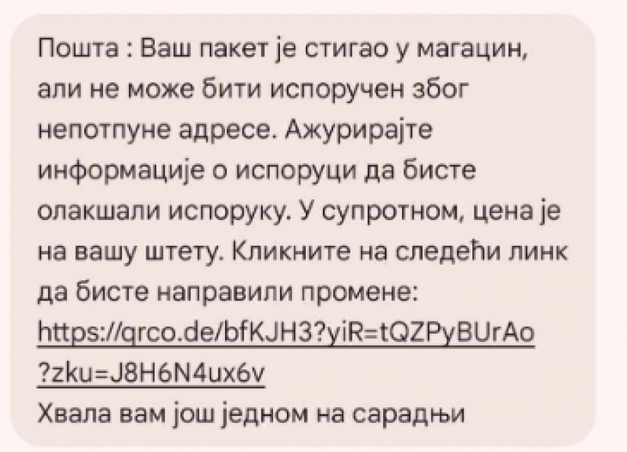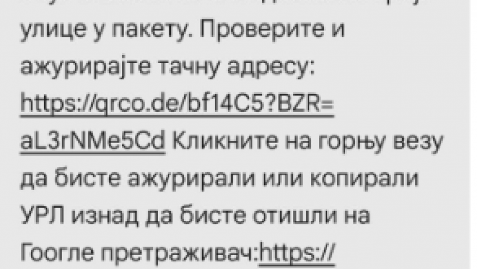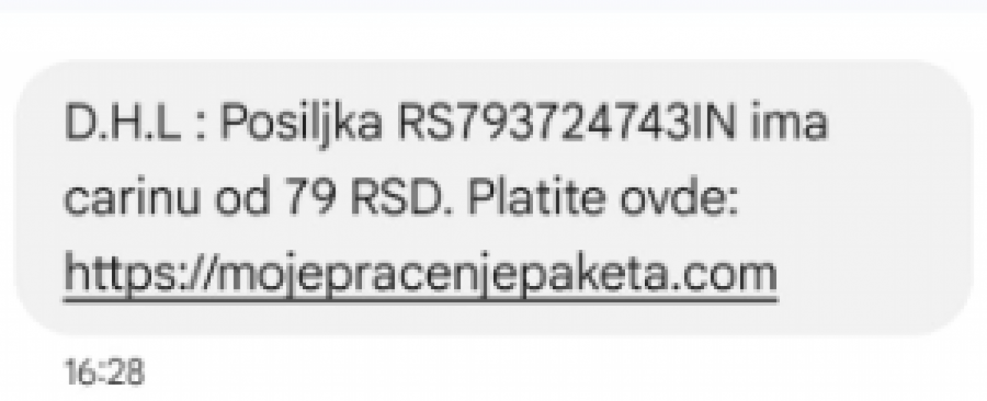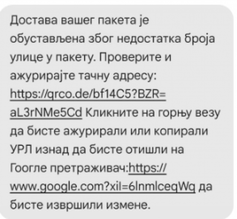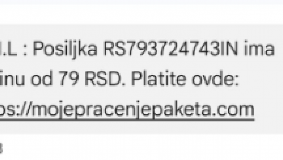 Jedan od primera pokušaja da prevaranti "navuku" i iskoriste građane jeste što u opisu poruke traže da se uplati iznos od 79 dinara i to preko njihovog maliciozanpg linka "pratitemojpaket".