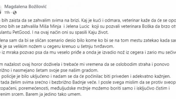 - on je iz mraka pozvao psa da mu veselo priđe a onda je izvadio nož iz cegera i zario mu ga u vrat. Ja sam nažalost ovaj horor doživela i trebaće mi dosta vremena da se oslobodim straha i ponovo bezbrižno i nasmejano šetam svoje pse našim gradom - navela je ona u svojoj objavi.