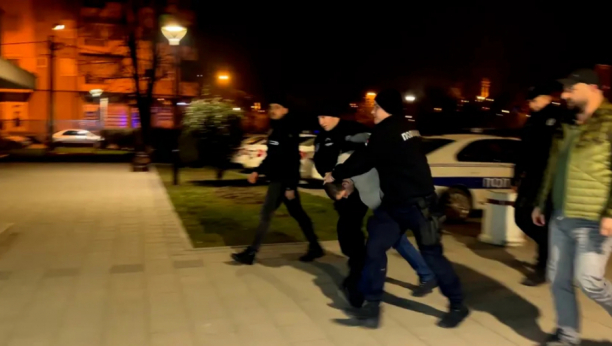 Policija je pod rotacijom došla do stanice, a potom je iz marice izveden osumnjičeni muškarac. Dva policijska službenika izvela su ga iz marice povijenog, sa lisicama na rukama koje su mu vezane na leđima.