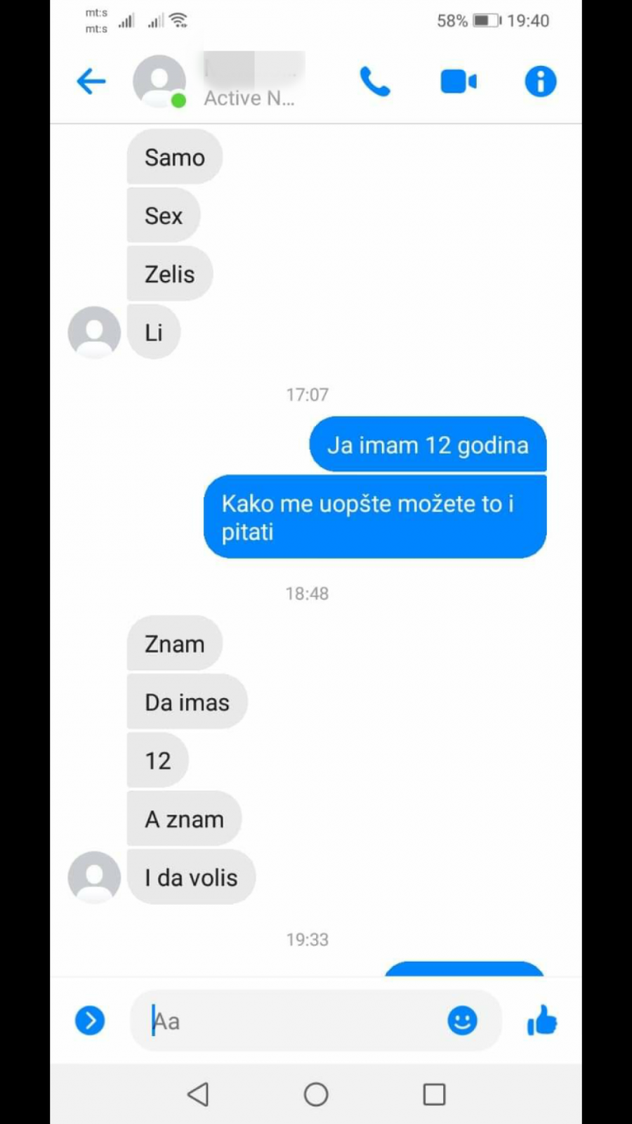 -Znam da imaš 12, a znam i da voliš...- napisao je M.B. koji je dalje insistirao da stupe u seksualne odnose.