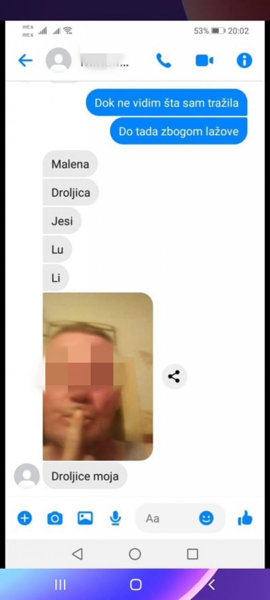 -Dokažite da niste Mihajlo iz mog razreda. Stavite prst na usnu i tako se slikajte, ali da vam se vidi celo lice i onda ću znati da me ne lažete-zatražila je maloletnica.