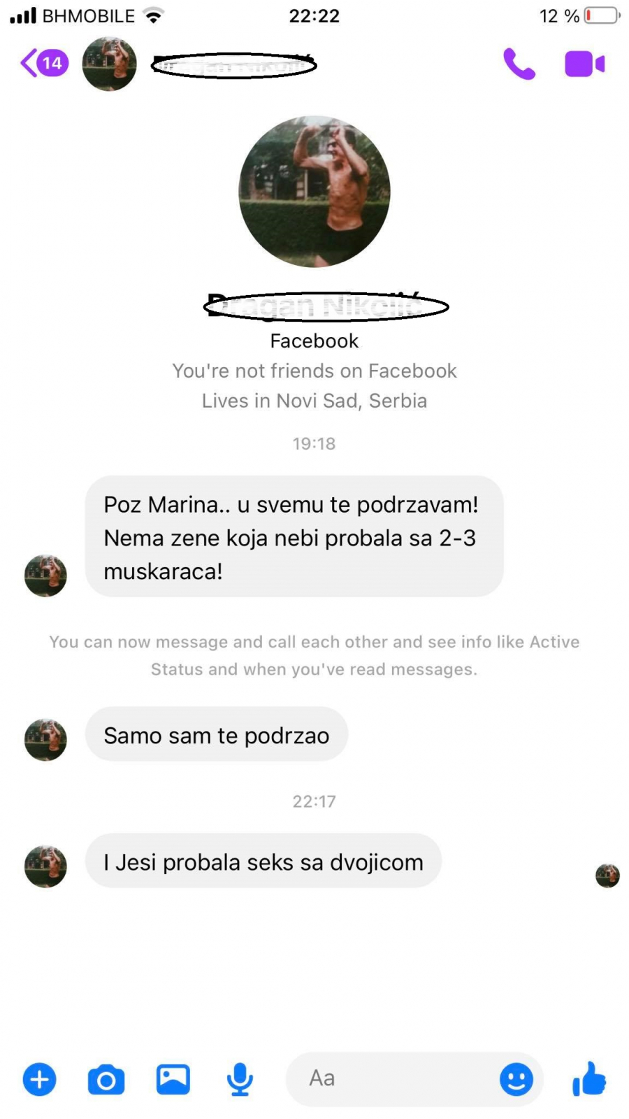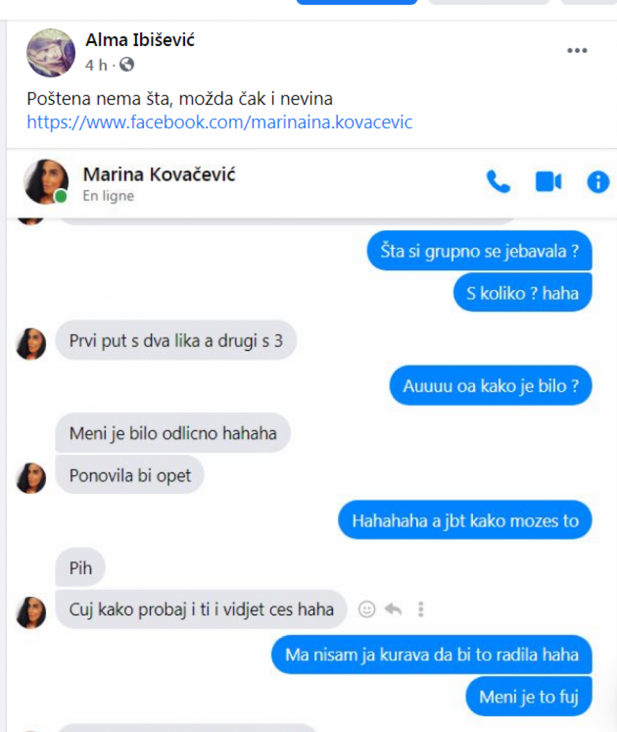 - Nekoliko osoba koje imaju profile sa ženskim imenima napale su me jer sam stala u odbranu žena koje su članice Fejsbuk grupe "Lude i otkačene" čiji sam administrator. Ne dozvoljavam vređanje članica. Nedugo zatim, počele su sa pretnjama, proganjanjima i zastrašivanjima. Želele su psihički da me kontrolišu. Pretile su mi da, ako ne uradim kako one žele i ne postavim jednu od njih kao moderatora u grupi, objaviće razgovor sa mnom i prepiske koje su one sastavile i lažno napravile - objašnjava naša sagovornica.