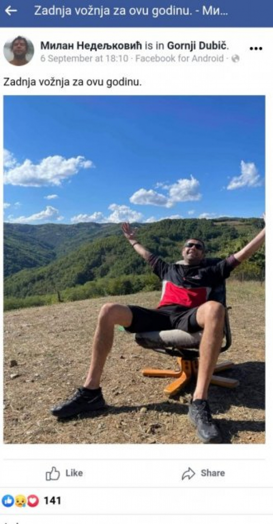 "Zadnja vožnja za ovu godinu”, napisao je 6.septembra uz svoju fotografiju u Gornjem Dubiču kod Trstenika (Milan Nedeljković) (41), koji je izgubio život u nesreći koja se dogodila na obali Zapadne Morave.